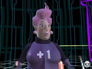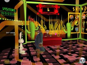 Als die beiden ein paar der Computersüchtels wieder auf den rechten Pfad gebracht haben, machen sie sich selbst in den Cyberspace auf, um dort nach dem Rechten zu sehen. Dazu müssen sie nur bescheuerte Cyberbrillen aufsetzen. Das Programm sorgt dafür, dass die virtuelle Welt der echten bis aufs i-Tüpfelchen gleicht. Nun ja – so ist es zumindest gedacht, denn natürlich läuft einiges schief. Nicht umsonst erinnert hier manches an die unausgereiften Produkte aus dem Hause Microsoft: Wie in der Realität poppen irgendwelche nervigen Hilfefunktionen auf, die politisch korrektes Techigefasel von sich geben. Klar, dass Sam und Max hier einige spöttische Sprüche zum Besten geben…