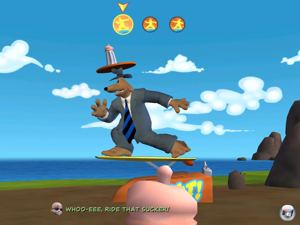 Surfbrett und müsst nach vorne und hinten wippen, um den Milchflaschen auszuweichen. Gleichzeitig müsst ihr noch Hoffas Babyfläschchen auf dem Kopf balancieren. Mit ein wenig Herumprobieren ist das ebenso hinzubekommen, wie die Autoraserei, bei der es dieses Mal gilt, Dudelsäcke umzuheizen. Mal was anderes als die ewigen Omis aus GTA 3: San Andreas, die langsam langweilig werden. Immerhin kommt dabei noch ein Klangstück heraus, das allemal besser anhört als Max‘ Darmflöte. Selbst Glen Miller, der auch auf der Insel ist, ist seine Furzerei zu schlicht.