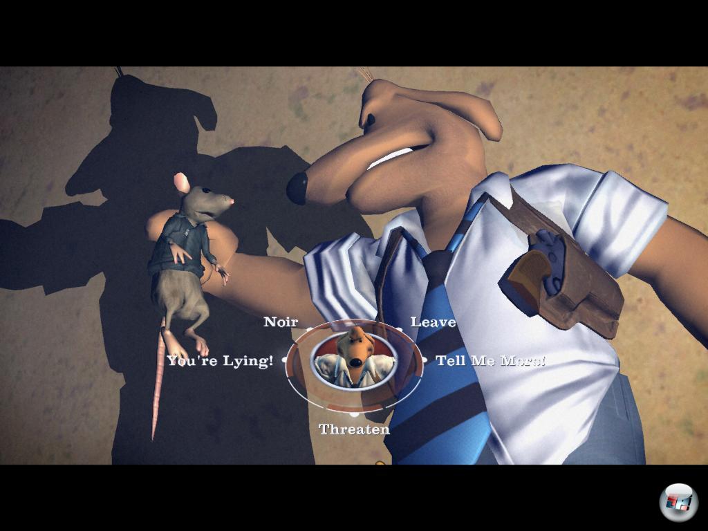 Um eine Antwort zu bekommen, dreht Sam ein paar einsame Runden im Desoto durch die Stadt. Sein Monolog aus dem Off erinnert schon an Klassiker des Detektivfilms wie Die Spur des Falken, nur dass er eben kein Bogart ist sondern ein verschwitzter Hund. Hier werden allerdings keine Verbrecher in die Mangel genommen, sondern die üblichen Verdächtigen, die halt so in einer Sam & Max-Episode von Telltale vorkommen. Ein scheinbar geläuterter Affe, Johnny die Ratte und ein Tourist mit europäischem Akzent. Bei der Befragung kommt es entscheidend darauf an, was man fragt. Nur so kommt man bei dieser kurzen Passage ans Ziel, wo man erfährt, dass ein ganz bestimmter Bösewicht Max Gehirn hat. Um da durchzublicken, sollte man schon einigermaßen gut Englisch können, denn das Spiel gibt’s nur im Original.