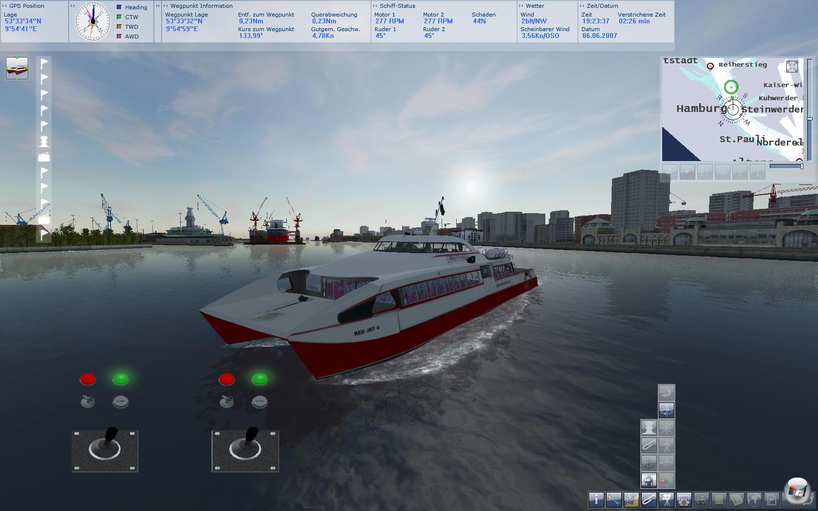Für meine Jungfernfahrt habe ich mich als Neu-Hamburger natürlich für eine große Hafenrundfahrt auf der Elbe entschieden. Im schicken Red-Jet-Katamaran lege ich von den zwar etwas steril, aber durchaus realistisch nachempfundenen Landungsbrücken ab. In Ermangelung eines Tutorials erweist sich das Ganze zunächst als etwas gewöhnungsbedürftig, aber mit der ausgedruckten Spielanleitung (die liegt nämlich nur als PDF-Dokument vor) komme ich als Simulationsfan einigermaßen schnell hinter die Steuerung.