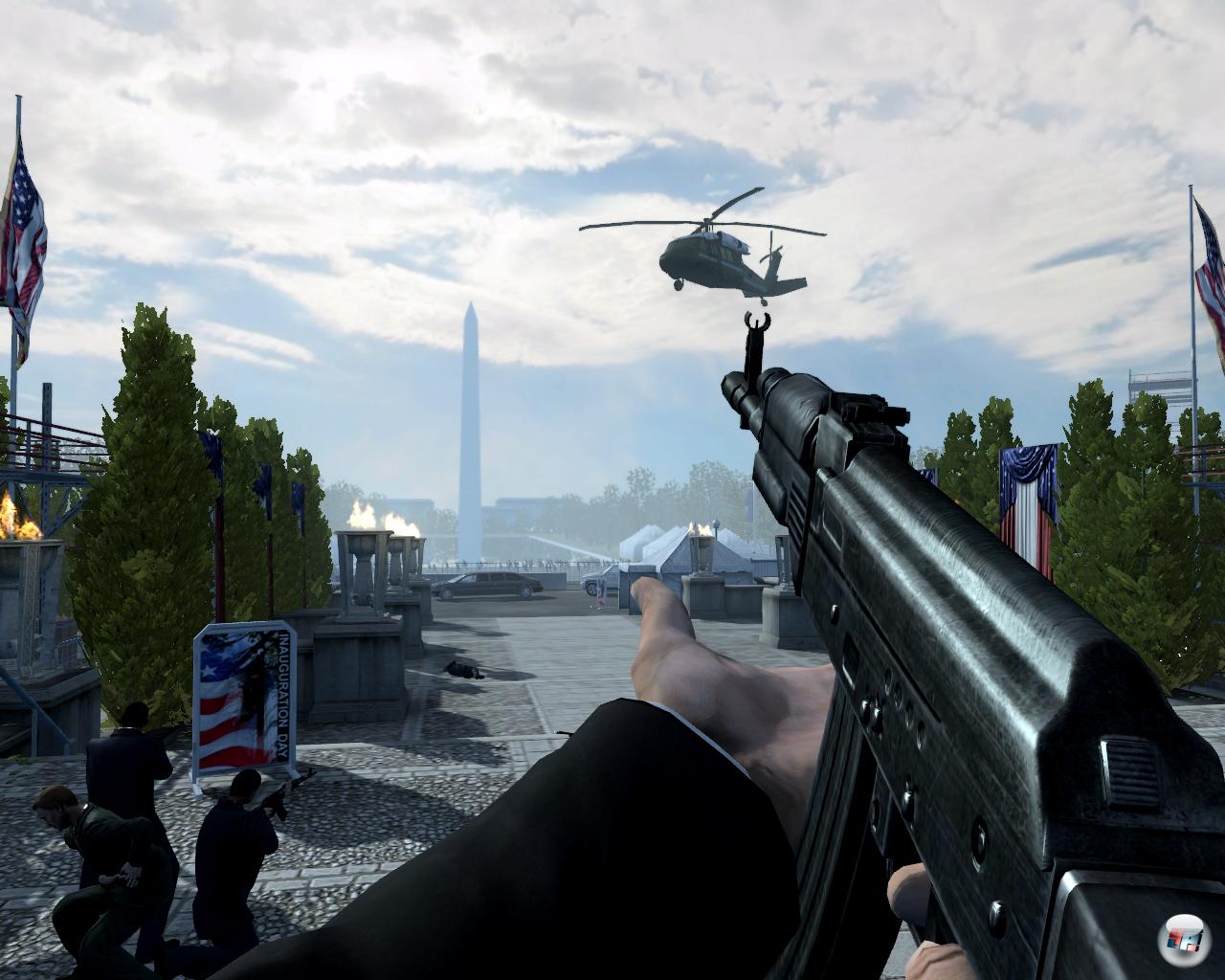 Nun gut, sprachliche Erheiterung mal beiseite geschoben, den Türsteher aus Willis Muckibude, den die Entwickler mal eben aufs Cover gedrängt haben, lassen wir auch schnell hinter uns. Was bleibt ist ein Shooter, der überdeutlich aus Vonderstangenhausen kommt, was schon an der Präsentation deutlich wird: Auf den ersten Blick wirkt das Gezeigte gar nicht mal so schlecht, auf den zweiten offenbaren sich grob gehauene Figuren, die im Falle der Gegner direkt dem nächstgelegenen Klonlabor entsprungen sind – pro Level gibt es kaum mehr als drei unterschiedliche Figuren zu sehen. Die Umgebung ist teilweise kaputtbar, allerdings inkonsequent: Scheiben, Büsten und Säulen lassen sich perforieren, nur Schüsse auf Wände hinterlassen irritierenderweise keinerlei Spuren. Die Levels, die zum großen Teil innerhalb amerikanischer Wahrzeichen wie dem Oval Office oder dem Capitol spielen, sind unspektakulär aufgebaut (was eine strenge Linearität zur Folge hat) und sehr einfach schattiert, aber teilweise ansehnlich texturiert – besonders Gemälde oder Kronleuchter sind nett anzusehen. Kurz gesagt: Ambitioniert, aber kaum zeitgemäß.