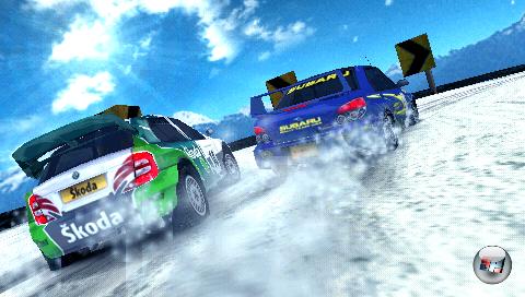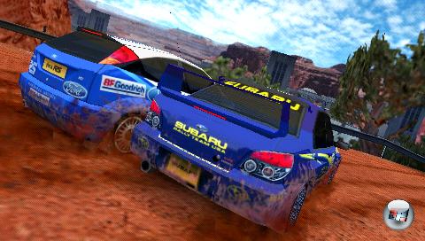 Nein! Denn schon nach den ersten paar Metern möchte man den Entwicklern auf die Schulter klopfen und ein „Respekt“ über die Lippen bringen. Die Kulissen der jeweils drei Safari-, Canyon, Tropen-, Arctic- und Alpen-Pisten sehen phänomenal aus und laufen konstant flüssig. Anstatt die Kurse 1:1 zu übernehmen, wurden der Handheld-Fassung eigene Strecken spendiert, die sich ebenfalls durch Abwechslungsreichtum auszeichnen, aber insgesamt zu knapp ausfallen – zumal es hier keine Variationen zu geben scheint, in der ihr sie z.B. umgekehrt in Angriff nehmen könnt. Mit flatternden Vögeln am Himmel über dem Dschungel, sich bewegenden Gondeln im Alpenland, umher fliegenden Hubschraubern, animierten Kränen oder dem Blitzlichtgewitter der Zuschauer am Streckenrand wirken die Fahrten alles andere als steril – hier ist Leben auf, neben und über der Piste! Ein besonderes Lob gebührt den umwerfenden Partikeleffekten, wenn euch in der Verfolgerrolle feiner Sand oder aufgewirbelter Schnee des Vordermanns die Sicht erschwert. Hier ist die kleine Handheld-Version sogar den großen Konsolenfassungen überlegen, die zwar mit Polygondreck um sich wirft, aber keine so dichten Staubwolken bietet. Ebenfalls schön: Die Boliden hinterlassen Reifenspuren, so dass ihr von Runde zu Runde erkennt, wo lang gefahren wurde. Zwar wird die Strecke nicht wie auf den Konsolen in Echtzeit deformiert, doch zumindest auf den alpinen Strecken zeigen die Reifenspuren Wirkung, wenn die Eisschicht auf der Ideallinie langsam abgetragen und der Asphalt darunter freigelegt wird. Auch die Pfützen, in denen sich sogar die Landschaft spiegelt sehen zusammen mit den herrlichen Wasserfällen an manchen Tropenpisten prima aus. Hier haben die Jungs von Bugbear ganze Arbeit geleistet. Kein Wunder, denn das Team konnte schon mit der Flatout-Serie im Offroad-Terrain begeistern. Jetzt warten wir auf eine PSP-Version… Einen kleinen Schönheitsfehler gibt es aber doch: Genau wie auf den Konsolen werden eure Ausflüge von z.T. starken Pop-Ups und Fade-Ins begleitet, bei denen sich ganze Landschaftsstriche sehr plötzlich (und spät) aufbauen.