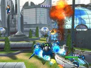 einer glitzernden Hightech-Stadt. Und ein Sam wäre kein Sam ohne geschätzte zwei Fantastilliarden Gegner: fies lachende Hexen, Raketenwerfer-Teufel auf Ketten, aufziehbare Nashörner, Zombie-Börsenmakler, mit explosiven Törtchen bewaffnete, Einrad fahrende Clowns, die bekannten Bombenkopf-Selbstmörder, dicke weibliche Teufel, riesige Robo-Tyrannosauren oder schwer bewaffnete Schneemänner sind nur eine kleine Auswahl der Widersacher, die sich in gefühlten Hundertschaften in Richtung eures Laufs heranstürmen.Am Ende jeder Welt wartet außerdem ein Bossgegner. Sam-Kenner wissen, dass dieser Ausdruck ein Euphemismus ist. Denn die Biester sind riesig. Wirklich, wirklich groß! »Bildschirmfüllend« wäre teilweise noch untertrieben, diese Giganten sind einfach überall: eine Art King Kong, den man nur indirekt bekämpfen kann, eine riesige Biene, ein wahnsinnig fetter Prinz mit Vorliebe für scheußlichen Gesang, ein dicker Drache oder der Mörder-Roboter Hugo, dem konventionelle Waffen gleich gar nichts anhaben können – wunderbar! Was hält man solchen Zeitgenossen ins Gesicht? Plasmaknarren, Raketenwerfer, eine doppelläufige Schrotflinte, eine Minigun, die die Munition schneller frisst als der durchschnittliche Redakteur Popcorn, einen putzigen Zielsuchpapagei mit Bombe oder eine dicke Kanone, die noch dickere Kanonenkugeln verschleudert – das meiste davon ist dem Sam-Kenner schon aus den Vorgängern bekannt.