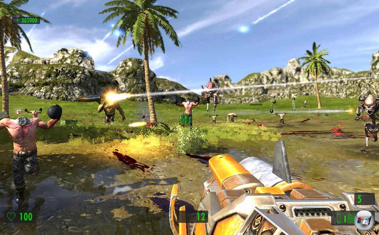 Es gibt allerdings eine Sache, welche die 360-Fassung sehr deutlich von der PC-Version unterscheidet. Eine Sache, die sich negativ auf den Spielspaß von Serious Sam auswirkt, greift sie doch einen Kern des grundsätzlichen Designs an: den Koop-Modus. Keine Bange, er ist nach wie vor vorhanden, allerdings dürfen sich statt wie gewohnt 16 nur noch vier Spieler gleichzeitig mit den Schergen des Bösen anlegen! Dadurch wird das Vergnügen zwar nicht gerade geviertelt, aber trotzdem ist es etwas deutlich anderes, wenn man nur als ballerndes Grüppchen loszieht statt als rabiater Großhaufen! Immerhin hat diese Beschränkung den Vorteil, dass der Bildschirm nicht vor Anzeigen überquillt, aber dennoch ist es enttäuschend – ganz besonders angesichts der Tatsache, dass auch auf der 360 keine weiteren Multiplayermodi zur Auswahl stehen.