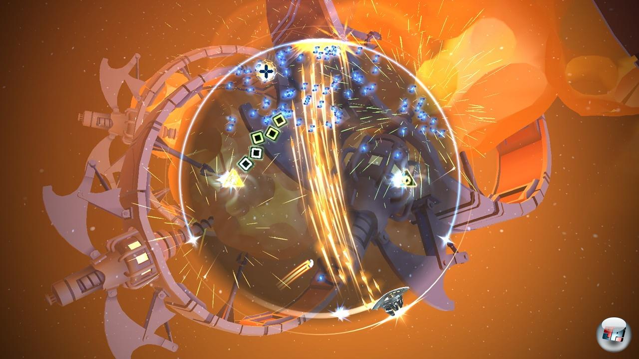 All zu sehr sollte man sich aber nicht von der audiovisuellen Pracht einlullen lassen. Shatter bietet zwar ein entspannteres Spieltempo und einen deutlich niedrigeren Schwierigkeitsgrad als aktuelle Zweistick-Shooter – im Splitterinferno geht trotzdem ab und zu die Übersicht verloren. Ein weiteres Manko ist der Umfang: Es dauert zwar rund zwei Stunden, bis man alle Levels hinter sich gebracht hat, doch danach warten nur noch ein Boss-Rush und ein minimalistischer Classic-Modus auf den Spieler. Natürlich kann man auch in der normalen Karriere und in einzelnen Welten auf Punktejagd gehen – leider ist das aber nicht so motivierend wie z.B. in Geometry Wars: Retro Evolved 2 <A class=DYNLINK onmouseover="DynToolTipp_Show('Klicken für Gameinfos‚)“ onmouseout=“DynToolTipp_Hide(); “ href=“javascript:DynCont_Display(‚Gamefinder‘,’runmod.php?sid={SID}&LAYOUT=dyncont_gf&spielid=16368′)“> oder in Super Stardust HD.