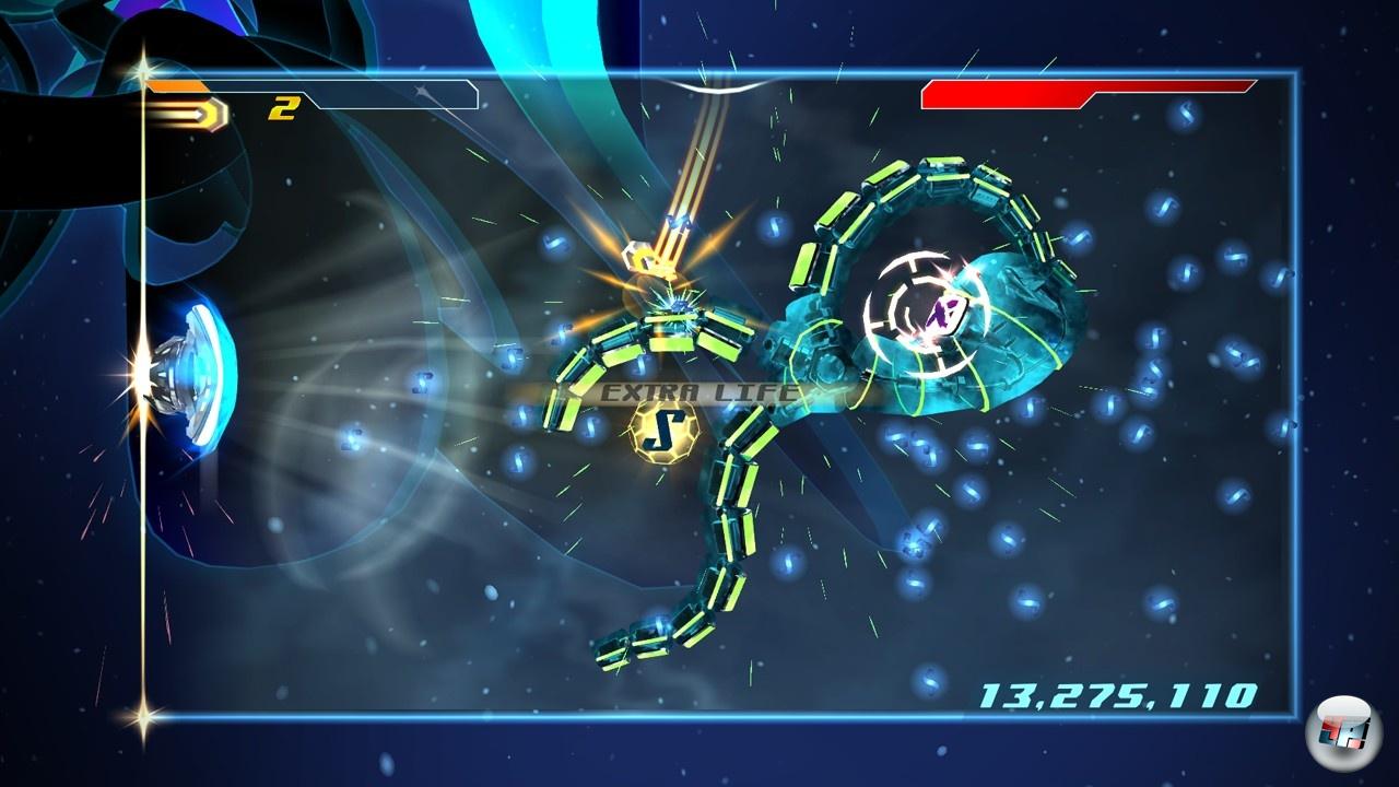 Die bunt glühenden Techno-Biester lassen das Herz eines jeden Psychedelic-Shooter-Fans höher schlagen. Auch die Reise durch die dreidimensionalen Hintergründe mit ihren leuchtenden Schaltkreisen und Edelsteinen passt prima. Die technische Brillianz von Super Stardust HD <A class=DYNLINK onmouseover="DynToolTipp_Show('Klicken für Gameinfos‚)“ onmouseout=“DynToolTipp_Hide(); “ href=“javascript:DynCont_Display(‚Gamefinder‘,’runmod.php?sid={SID}&LAYOUT=dyncont_gf&spielid=12004′)“> erreicht Shatter zwar nicht, trotzdem erzeugt das weich schimmernde Neon-Design eine ganz eigene Stimmung. Das Highlight des Spiels ist aber der Soundtrack von Jeramiah Ross aka Module. Seine Tracks wirken wie eine Reise von hypnotischen Elektro-Loops über komplexe Melodien im Stil alter Computerspiele bis hin zu langen Gitarrensolos, welche an die epischen Stücke von Pink-Floyd oder Mike Oldfield erinnern.