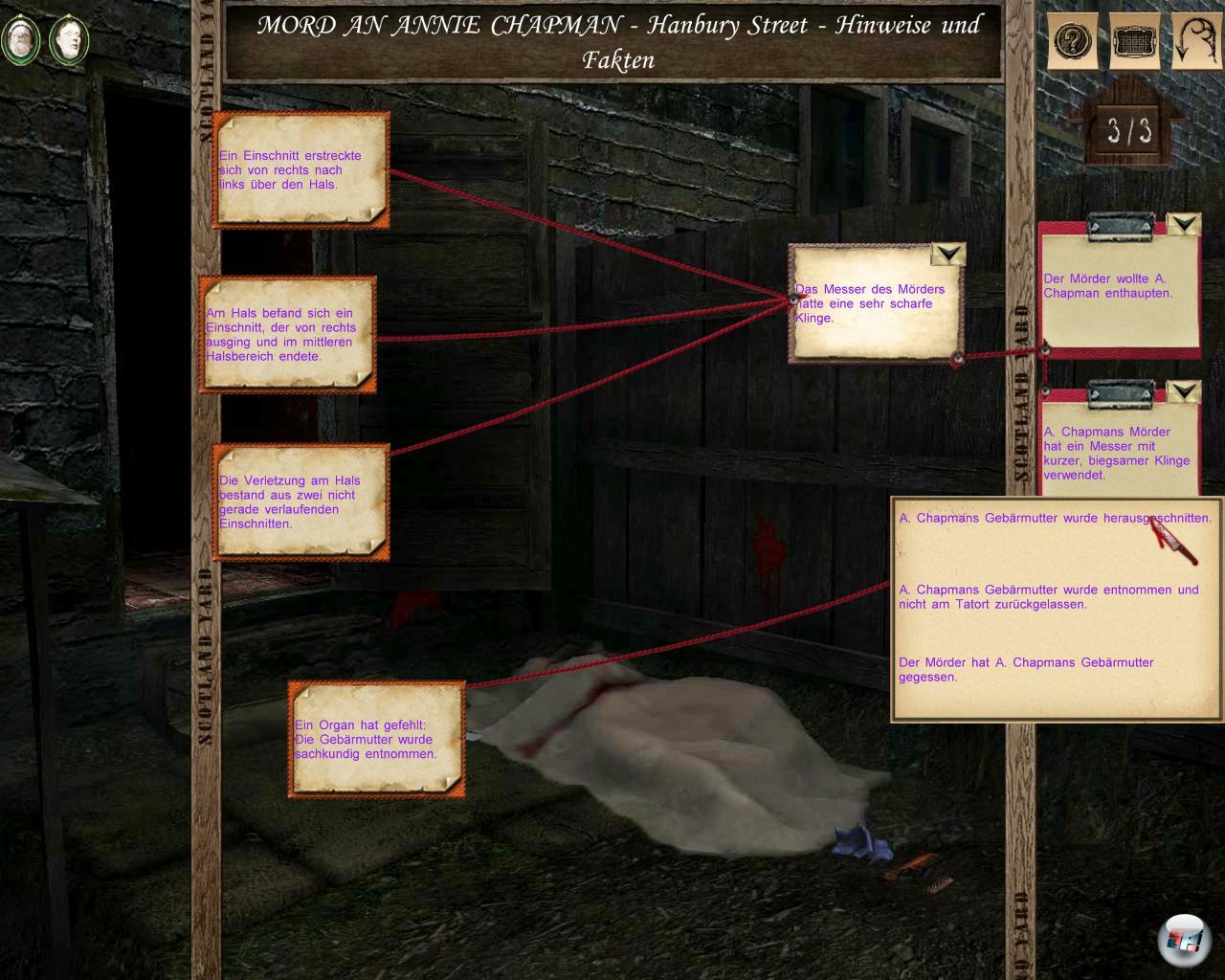 Allerdings gibt es dann wieder unvermutete Highlights, die sich besonders an Krimifans wenden. Niemand erklärt so schön wie Holmes die zeitliche Abfolge der Morde, die einem aufgrund sich widersprechender Zeugen total verwirrend vorkommt. Minutiös werden alle Aussagen in ein Zeitraster eingeordnet und am Schluss muss Watson, der niemand anderer ist als der Spieler, dann raten, wann die Tötung stattfand. Manche Sachen habe ich so zum ersten Mal richtig verstanden, obwohl ich mich seit Jahren für die Whitechapel Morde interessiere. Etwa, dass der Täter am 30. September, als zwei Frauen umgebracht wurde, genug Zeit hatte, vom einen Schauplatz zum nächsten zu laufen.