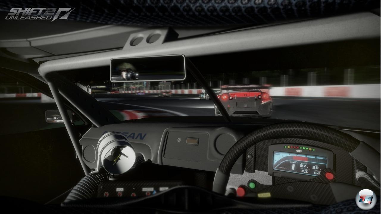 einem sichtbaren Grafikaufbau am Straßenrand kommt. Bei den Automodellen fährt der PC den Konsolenverfolgern ebenfalls davon und bietet detailliertere Fahrzeuge, die aber auch hier nicht an die fantastischen Premium-Modelle aus GT5 heran reichen. Auf den Konsolen ist Shift 2 deshalb kein technischer Rohrkrepierer, denn die Rennen laufen auch hier überwiegend flüssig über den Bildschirm und vor allem die Lichteffekte können sich auf PS3 und 360 sehen lassen. Das Problem ist dort die schwankende Qualität: Vor allem bei Stadtkursen fallen die groben Texturen an den Häusern auf und auch die Nordschleife ist mit ihren hässlichen Bäumen sowie 2D-Tapeten keine Augenweide. Einen besseren Eindruck hinterlassen klassische Pisten wie Laguna Seca, Donington, Brands Hatch oder Catalunya, um nur einige Beispiele der exzellenten Streckenauswahl zu nennen, die neben Lizenz-Tracks und Stadtkursen auch ansprechende Fantasie-Konstruktionen zu bieten hat – diverse Ausführungen inklusive. Warum beim Start manchmal das Bild schwarz bleibt und erst mit einem Druck auf die Pause-Taste erscheint, dürfte wohl ein Geheimnis der Bug-Liste bleiben, zu der auch manchmal seltsam hüpfende Wagen in der Startaufstellung gehören. Zum Glück treten diese Phänomene nur selten auf; störend sind sie trotzdem.