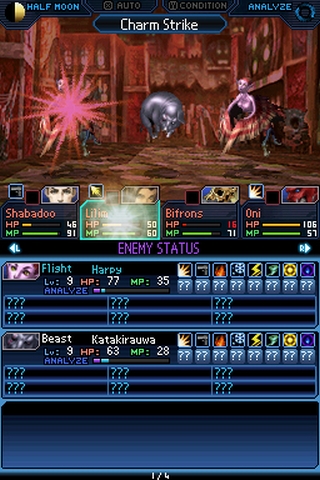 Anders sieht es hingegen bei den neuen Team- bzw. Bonusattacken aus, die nicht länger die Verkettung von Angriffen auf individuelle Schwachstellen, sondern eher die moralische Integrität der Kampfteilnehmer belohnen. Natürlich muss man auch in Strange Journey gezielt Schwachstellen ausfindig machen und aufs Korn nehmen, um zusätzliche Treffer landen zu können. Aber statt diese gekonnt miteinander zu verknüpfen, reicht es jetzt einmal zu treffen und alle Partymitglieder gleicher Gesinnung hauen automatisch mit drauf. Das klingt anfangs vielleicht gar nicht so schlecht, aber da es nur drei Gesinnungen mit jeweils genügend Vertretern gibt, formt man einfach eine einheitliche Multifunktionsparty um die moralische Ausrichtung des Protagonisten und teilt immer ordentlich aus. Bonusattacken der Gegner wurden sogar komplett fallen gelassen, so dass man sich auch um die eigenen Schwächen nicht mehr so viele Gedanken machen muss.