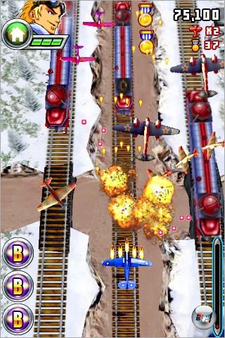 Während man sich vertikal fliegend die Heerscharen des Bösen vom Hals hält, gibt es viel einzusammeln. Komplett zerschossene Formationen hinterlassen diverse Extras: Punkte bringende Medaillen, Smartbombs, Heilpäckchen, Extraleben, Schutzschilde, Waffenverstärker – oder gleich Extrawummen wie Blitze oder weit fächernde Superschüsse. Am Ende der meisten der zwölf kurzen Levels wartet ein extradicker Flugobermotz auf seine verdiente Abreibung. Speziell bei diesen fiesen Hunden erweist sich der R-Type-kompatible Megaschuss als hilfreich: Hält man einen zweiten Finger auf das Touchpad, lädt sich die Kanone kurz auf, lässt man los, wird ein gewaltiger Energieschwall abgefeuert.