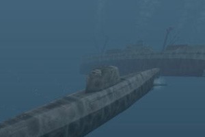 | Ein Wrack sinkt hinter unserem U-Boot in die Tiefe. |