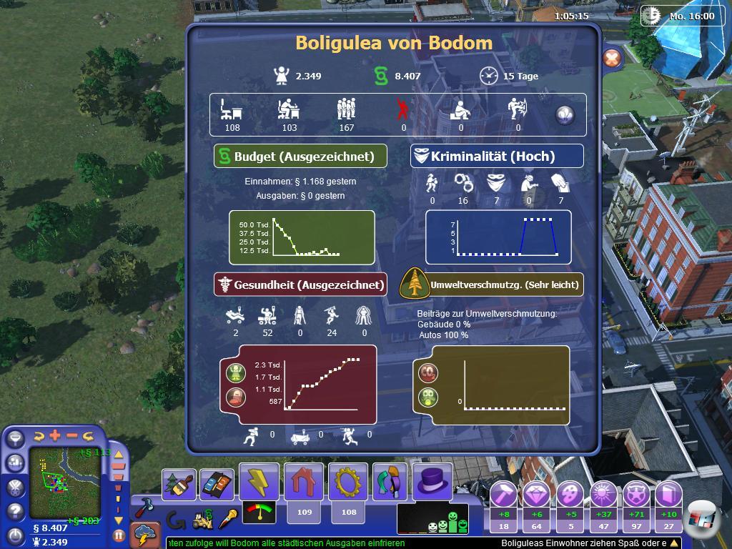 Ebenfalls recht stiefmütterlich behandelt werden die Einwohner, die zwar in Sim-Sprache brabbelnd durch die Straßen gehen, aber am Ende doch eine gesichtslose Masse bleiben. Ihr könnt sie zwar anklicken, um etwas über sie zu erfahren, aber das ist ohne Sinn. Was nützt es zu wissen, wo der Schuh drückt, wenn ihr dann ohnehin wenig ändern könnt. Aufträge von Einzelnen wie bei Tycoon City müsst ihr nicht lösen, um vorwärts zu kommen. Zudem sind die Leute auf der Karte nicht leicht zu finden, weshalb es praktisch unmöglich ist, eine der Spezialisten wie Priester, Aktivist oder Wachmann in Aktion zu sehen.