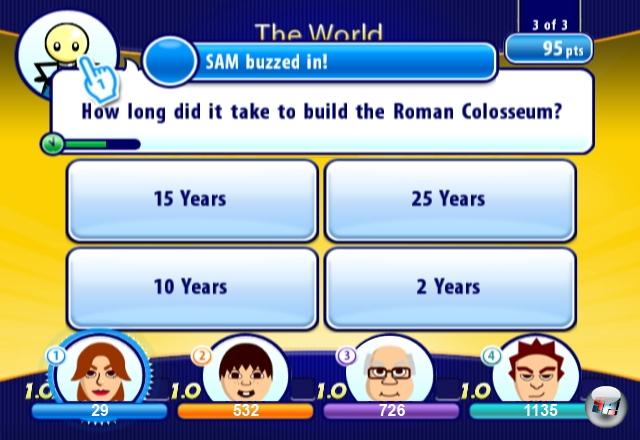 Wer es nicht so klassisch mag (die Punkte für jede Frage zählen mit dem Timer runter), kann auch den so genannten Einsatz-Modus wählen. Hier wird vor jeder Frage – aber nach Bekanntgabe der Kategorie- ein kleines Schießstand-Minispiel gestartet, das den Punktwert der Frage ermittelt. Nehmen wir z.B. an, dass die nächste Aufgabe aus dem Sportbereich kommt. Gehen wir jetzt weiter davon aus, dass ihr mit Sport nichts oder nur wenig am Hut habt, während der Kumpel der absolute Crack ist und schon freudestrahlend neben euch auf dem Sofa hin und her wackelt. Auf dem Schießstand wird er nun natürlich versuchen, die grünen Ziele abzuschießen, die ein Ansteigen der Punkte markieren. Wenn ihr ihm die Suppe versalzen wollt, etwa, weil euer Vorsprung in Gefahr geraten könnte oder auch nur aus purer Bosheit (ja!), schießt ihr auf die roten Ziele und senkt die maximale Punkteausbeute wieder. Zieht nun in Betracht, dass noch zwei andere Spieler mit von der Partie sind, die alle ihre eigene unberechenbare Agenda verfolgen und dieses simple und eigentlich unbedeutende Minispielchen gewinnt nicht nur an Bedeutung, sondern auch an Spaß…