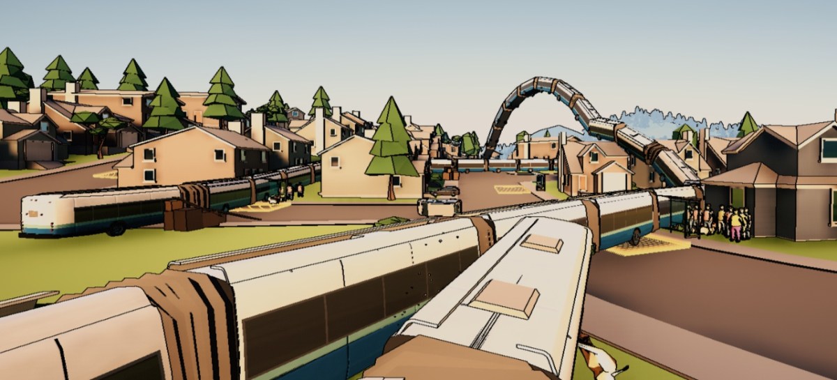 Doch genug der Vorrede, das Spiel gibt sich schließlich auch nicht mit einleitenden Worten, einer Geschichte, einem Spielziel oder erklärenden Tutorials ab. Stattdessen bekommt man einfach ein Hauptmenü vorgesetzt, wo Gefährt, Level und Spielmodus ausgewählt werden – und schon geht das Snakeybus-Chaos los. Das Spielprinzip ist ausgesprochen simpel: Man fährt als Bus (mit automatischer Geschwindigkeit, schneller ist aber möglich) durch kleine Sandbox-Stages, sammelt an Haltestellen durch bloßes Vorbeibrettern Fahrgäste auf und liefert sie an einem von vielen Orten ab. Als Belohnung dafür wird der Bus länger und länger und länger – bis irgendwann das halbe Level mit der Blechschlange gefüllt ist und man aufpassen muss, sich nicht selbst im Weg zu stehen. Das Touchieren der eigenen Wagen wird, im Gegensatz zum Pixel-Schwarz im Nokia-Klassiker Snake, aber nicht sanktioniert – nur wenn man sich verkeilt und stehenbleibt, kommt der Game-Over-Screen. Das gilt aber auch für das Festfahren in Sackgassen oder einen Sturz in Fluss oder Teich.