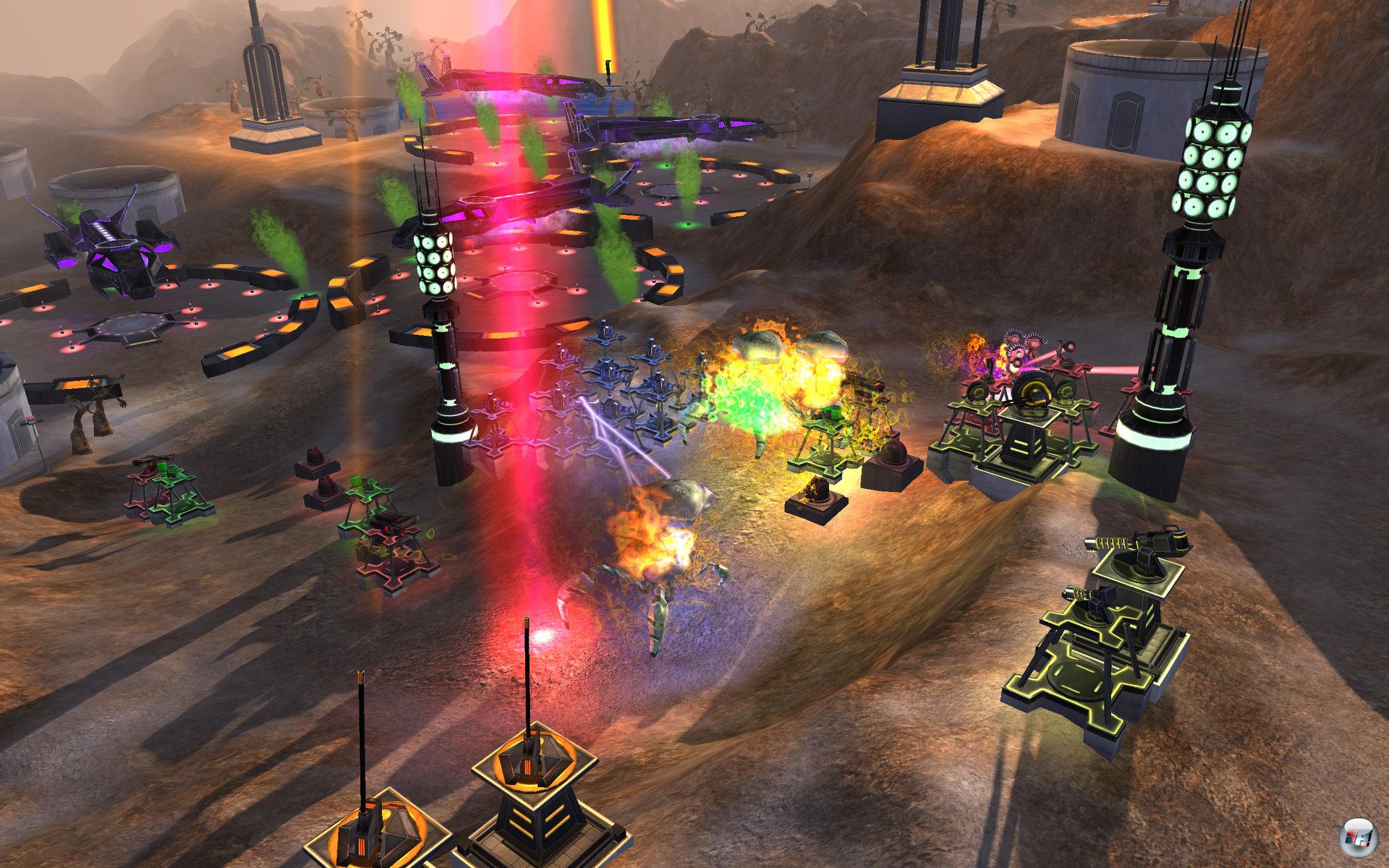 | Mit dem roten Laserstrahl (Orbitallaser) lassen sich vereinzelte Gegner vor oder nach der Turmbastion vernichten, sofern genug Energie vorhanden ist. |