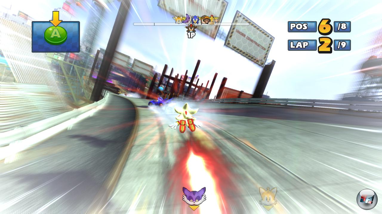 Apropos online: Bis zu acht Raser dürfen über die Internetleitung gegeneinander antreten – und das sogar auf der Wii. Leider beschränken sich die Duelle ausschließlich auf Einzelrennen, wobei man optional KI-Gegner hinzufügen, die Benutzung von Extras unterbinden sowie eine Aufhol-Funktion aktivieren kann, mit der das Fahrerfeld dicht zusammengehalten werden soll. In der Praxis merkt man davon allerdings nichts sehr viel: Hat man einmal einen gewissen Abstand herausgefahren, ist der Sieg so gut wie sicher, da man im Gegensatz zu Mario Kart hier keinen blauen Panzer oder etwas Ähnliches von oben fürchten muss. Wer nicht mit Fremden fahren möchte, kann eigene Lobbys aufsetzen – auf der 360 und PS3 ist im Gegensatz zur Wii auch das Anlegen von öffentlichen Sessions möglich. Dadurch hat man auf der Nintendo-Konsole oft das übliche Problem, das man per Zufall immer wieder in öffentlichen Lobbys landet, in denen der verantwortliche Host das Rennen einfach nicht starten will. Wohl dem, der eine volle Freundesliste hat und darauf verzichten kann… Beim Netzcode haben die Entwickler ganze Arbeit geleistet, denn selbst mit dem vollen Teilnehmerfeld von acht Spielern sind Lags auf allen drei Systemen die absolute Ausnahme. Da ist es eine Schande, dass man nicht mehr Arbeit in die Spielmodi gesteckt hat. Warum darf man z.B. nicht selbst kleine Turniere aufsetzen? Wo sind Variationen wie Ausscheidungsrennen oder Arenakämpfe? Das ist besonders seltsam, weil man genau das beim Mehrspielermodus im Splitscreen vorfindet, wo sich bis zu vier Spieler neben einem Standardrennen auch in drei Kampfarenen beackern, einen Chao schnappen und gegen die Angreifer verteidigen, Chaos Emeralds einsammeln, Zonen verteidigen oder sich in Ausscheidungsrennen miteinander messen dürfen. Dabei geht die Framerate zwar ebenfalls immer wieder etwas in die Knie und auch das Item-Balancing hat mit den bekannten Problemen zu kämpfen, doch kann man bei den Mehrspieler-Rangeleien insgesamt sehr viel Spaß haben.