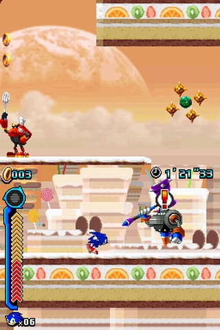 | Spielerisch orientiert sich Colours stark an Sonic Rush – das bedeutet Hochgeschwindigkeitsraserei auf (meist) zwei Ebenen. |