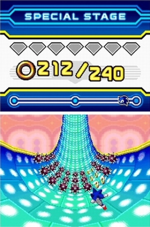 DS-Bildschirme, wodurch ihr ein doppelt so hohes Aktionsfeld wie üblich habt. Führt euch z.B. einLooping nach oben, wechselt das Spiel flüssig und übergangslos zwischen beiden Screens, wodurch sich die Action auf diesem fortsetzt. Dieser Übergang erfordert etwas Konzentration, geht aber nach sehr kurzer zeit in Fleisch und Blut über. Dazu gibt es schöne 3D-Spielereien, die Sonic bzw. Blaze auch mal in den Vordergrund bringen. Oder ihr hüpft auf einem 3D-Floß herum, könnt auch ein Stück weit in die Tiefe gehen und weicht so herabfallenden Steinen und Gegnern aus. Unter Wasser wabert die Ansicht wirkungsvoll, eine Kollision mit einem Gegner taucht den Screen in ein Ring-Fiasko. Und natürlich ist Sonic Rush schnell. Verdammt schnell. Teilweise so unglaublich schnell, dass man gar nicht komplett nachvollziehen kann, was da jetzt gerade auf dem Bildschirm vor sich geht. Ihr steuert eure Helden komplett digital, nur in den Bonuslevels kommt der Stylus mal zum Einsatz.