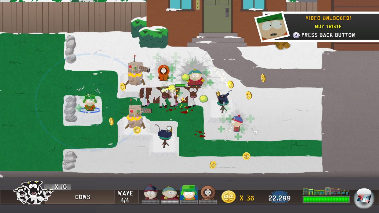 In geselliger Runde läuft South Park jedenfalls zur Höchstform auf – egal, ob mit bis zu drei Freunden vor der Konsole oder via Xbox Live. Sobald man sich abspricht und Aufgaben teilt, hat man deutlich mehr vom Spiel. Natürlich geht es gerade zu viert auch teils etwas chaotisch zu, aber die Spielqualität ist trotzdem gleich eine ganz andere und die Streitereien untereinander stehen denen der virtuellen Alter Egos, die sich stets beleidigen und Witze übereinander reißen, in kaum etwas nach. Anfangs muss man sich noch mit Stan, Kyle, Kenny und Cartman zufrieden geben, später darf man aber auch mit Bonuscharakteren wie Butters, Wendy oder Timmy ran.