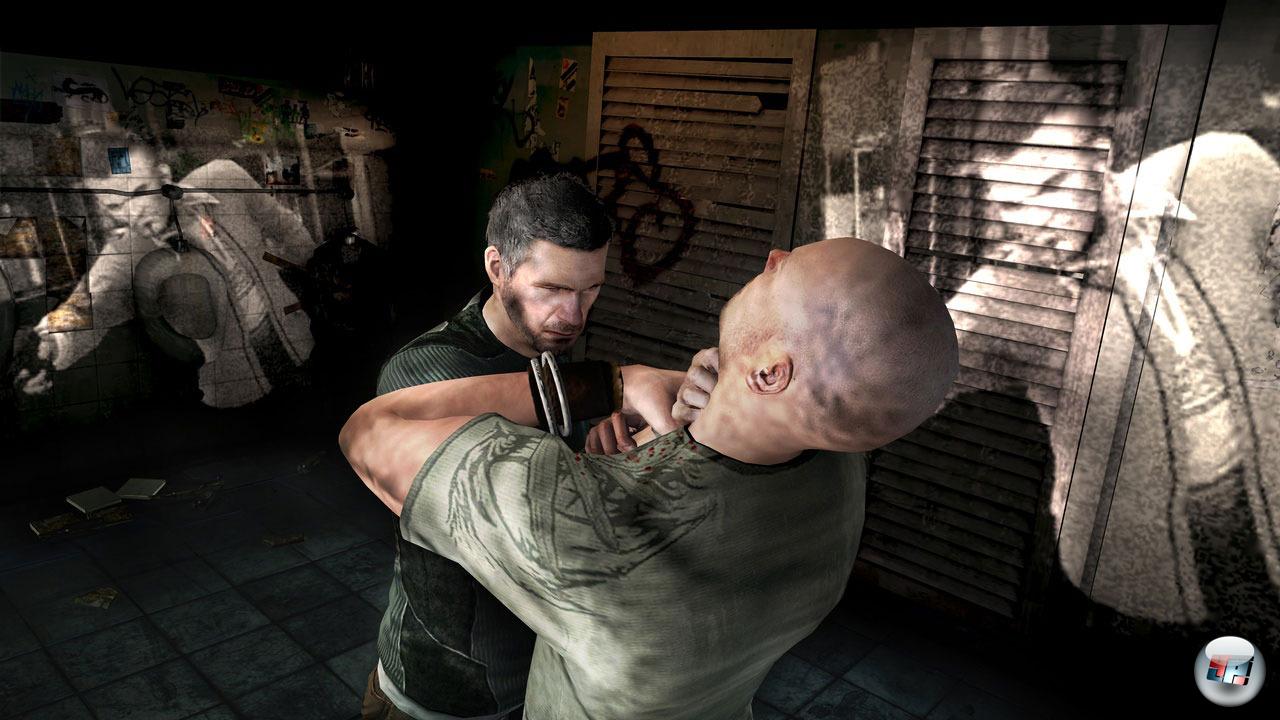 Überhaupt erlebt Sam nur dann ein glaubhaftes Zusammenspiel mit einem Charakter, wenn er einen dafür vorgesehenen Gegner in die Mangel nimmt und ihm handlungsrelevante Informationen entlockt. »Entlocken« klingt dabei allerdings so verharmlosend wie »Jack Bauer plaudert mit einem Informanten.« Genau wie der Kollege aus dem Pantoffelkino malträtiert Fisher nämlich alles, was bluten und knacken kann: Er drückt seine Geiseln in Fernseher, auf Tischkanten oder »tuckert« ihre Hand mit dem Taschenmesser auf einen Tisch – jedenfalls dann, wenn man die richtige Position für eine solche Animation findet. Und sobald er fertig ist, knackt es widerlich, sobald er die Faust an der Kehle zusammendrückt. Die Verhöre machen den spielerischen Ablauf interessant; bis auf die Wahl von Tisch oder Fernseher hat man allerdings keinen Einfluss auf den Verlauf der Verhöre und Fishers Aggressivität wird auch für diese Momente nicht als unvermeidliche Folge der Erzählung inszeniert. Denn auch das ist symptomatisch für das neue Splinter Cell: Es wird mit großem Aufwand präsentiert und will das »nächste große Ding« in Sachen Stealth-Action sein – gute Ideen werden allerdings hinter einer bemühten Inszenierung versteckt und von der spielerischern Banalisierung erdrückt. Spiel’s nicht noch einmal, Sam! Jedenfalls nicht so.