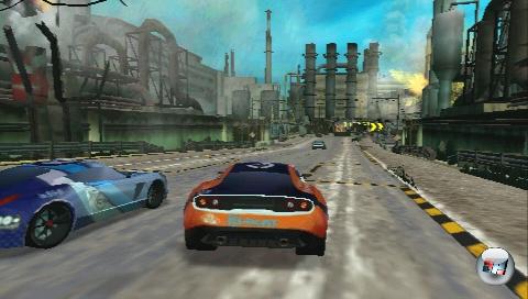 Die Schlitterexperten bei Sumo Digital (Outrun 2006 <a class="DYNLINK" onmouseover="DynToolTipp_Show('Klicken für Gameinfos‚)“ onmouseout=“DynToolTipp_Hide(); “ href=“javascript:DynCont_Display(‚Gamefinder‘,’runmod.php?sid=%7BSID%7D&LAYOUT=dyncont_gf&spielid=9003′)“>) zeichnen für die Umsetzung verantwortlich, das Original stammt von Blackrock. Beachtlich, dass die Sumos deren Spektakel ohne inhaltliche Einbußen in den Handheld gequetscht haben! Die Kurse sind exakte Durchschläge ihrer Blaupausen, alle Abkürzungen und Hindernisse befinden sich am gleichen Fleck. Technisch lässt die Kulisse selbstverständlich Federn – weder fliegen hier so viele Splitter noch qualmt es so eindrucksvoll wie auf den starken Plattformen. Dafür führen die Strecken an aufwändiger Architektur vorbei, die in anderen PSP-Titeln nur angedeutet wird. Im Detail sind die Oberflächen weniger klar definiert – im Gegenzug sieht man mitunter schon aus weiter Ferne, wie sie mit mehreren Detonationen auseinandergerissen werden. Einmal donnert man dabei gen Sonnenuntergang, ein andermal bricht sich das Licht tausendfach zwischen den metallenen Rohren und Verstrebungen eines Kraftwerks.