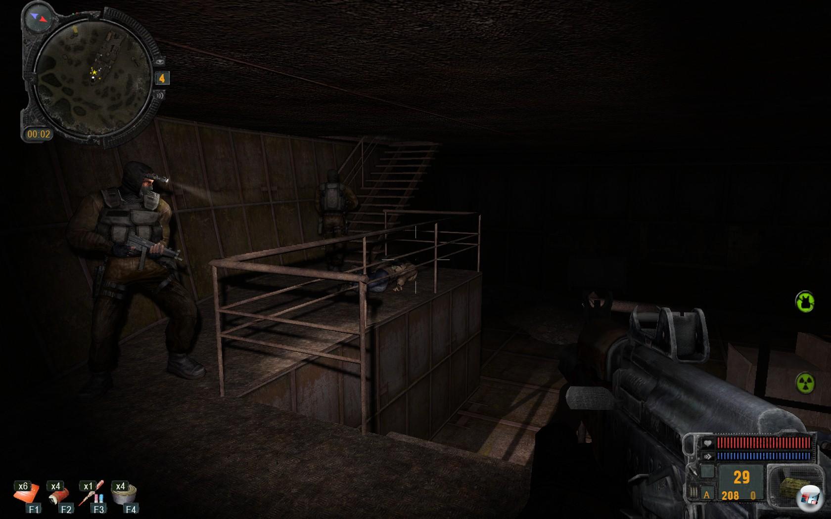 Die finanziellen Mittel, die somit bei der Präsentation eingespart wurden, sind scheinbar in das Questdesign geflossen: GSC Game World hat erstaunlich gute und spannende Missionen gestrickt. Ohne groß spoilern zu wollen (beschriebene Missionen stammen aus dem ersten Gebiet), müsst ihr ein Objekt aus einer tiefen Felsspalte bergen, euch den Weg durch braune Gänge kämpfen und überall lauern Feinde, die mehr als nur einen Schuss wegstecken können. Dann überfallt ihr gemeinsam mit anderen Stalkern (Banditen) ein anderes auf Grund gelaufenes Schiff mitten in der Nacht: Es ist finster, im Hintergrund heulen seltsame Tiere, Lichtkegel von Taschenlampen schneiden sich durch das dichte Schilf und bewegen sich langsam vorwärts. Am Objekt der Begierde angekommen, entbrennt ein Feuergefecht, bei dem die Lichteffekte der Gewehre den Nachthimmel wie Blitze erhellen. Meine Kollegen und ich bahnen uns langsam den Weg bis zum obersten Deck vor. Leichen, die natürlich geplündert werden, zeugen von unseren Aktivitäten, bis einer der Mitstreiter meint: so, das war’s. Schiff gesäubert, Belohnung erhalten und