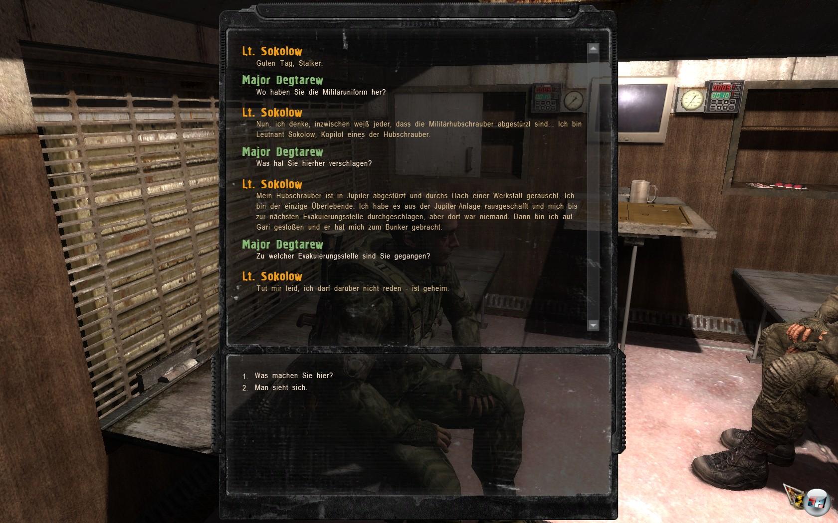 zum Beispiel gar nicht erreichen oder es kommen bei der Untersuchung neue Koordinaten zum Vorschein. Auch Gespräche mit NPCs oder in der Zone herumlungernden Stalkern (vorher die Waffen wegpacken, sonst kommt kein Dialog zustande) offerieren ständig neue Quests oder hilfreiche Informationen. Leider gibt es hier wieder eine Schwachstelle und zwar bei der Präsentation, da die Dialoge nicht vertont sind. Der Begrüßungssatz wird gesprochen, danach müsst ihr den deutschen Text lesen.