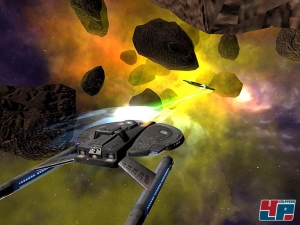 auch der rote Faden bleiben damit enttäuschend farblos. Kein „Energie!“ von Picard, keine geballte Faust von Kirk zu einem kernigen „Feuer!“, keine Janeway mit verwüstetem Haarteil, kein unbedeutender Offizier, den eine Explosion über die Brüstung der Brücke schleudern könnte – die eigentlichen Stars sind die Fortbewegungsmittel der Kapitäne.Tatsächlich sah die Enterprise (die NX-01, 1701 sowie 1701-D kommen im Spiel vor) nie schöner aus! Die detaillierten Modelle lassen mir das Wasser im Mund zusammen laufen und die restlichen Schiffe sowie Raumstationen – den ohnehin unspektakulären Borg-Würfel mal ausgenommen – stehen dem in nichts nach. Noch dazu drehen sie sich so träge um alle Achsen wie ihr es aus dem Fernsehen kennt. Umso bedauerlicher ist allerdings ihr merkwürdiges Verhalten bei Zusammenstößen, denn wenn zwei der Pötte aufeinander treffen, wackeln sie im schlimmsten Fall wie leichtes Plastikspielzeug umher und zerstören die perfekte Illusion. Schuld daran ist auch die Tatsache, dass Legacy nur in einem scheinbar dreidimensionalem Universum spielt: Ihr könnt euch zwar in alle Richtungen bewegen, doch zum einen dürft ihr keine „Loopings“ fliegen und zum anderen befinden sich sämtliche Objekte auf einer Ebene. Ihr könnt zwar über ein Hindernis hinweg steuern, doch im Grunde agiert ihr stets innerhalb einer vielleicht 1000 Meter dicken Fläche – was gerade mal zehn gefühlten Metern entspricht.