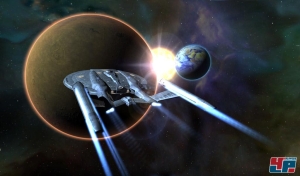Als ähnlich nervig habe ich Missionen empfunden, in denen ich meine Flotte teilen musste (z.B. um Versorgungsschiffe zu beschützen). Da springt ihr dann ständig zwischen vier Raumschiffen hin und her, um deren Wegpunkte zu ändern, Feinde anzugreifen oder selbst Hand anzulegen, was schnell die Übersicht zunichte macht. Denn auch wenn sich die Mitstreiter mit ihren eigenen Namen melden und die Pötte sogar unterschiedlich getauft wurden, sieht der Rest des Universums überall gleich aus, so dass ihr schnell die Übersicht verliert. Tatsächlich: Abgesehen von den für den Einsatz relevanten Objekten trefft ihr auf absolut gar nichts, was von einer atmenden Welt zeugen könnte. Wobei diese selbst in den knackigen Gefechten nur durch eine zugeschnürte Gurgel Luft holen kann. Denn spätestens wenn ihr seht, wie eine Raumstation oder ein Borg-Kubus auseinander fällt, ist jede Illusion dahin. Sobald sich riesige Polygonmassen mit abgeschalteter Kollisionsabfrage ineinander verschieben, sieht das nicht nur hässlich aus, sondern wirkt vor allem lächerlich. Ein weiteres, wenn auch unwesentliches Detail ist der sichtbare Schaden an euren Fortbewegungsmitteln: Selbst wenn euch feindliche Disruptor-Strahlen kaum Schaden zugefügt haben, sieht das getroffene Schiff aus, als hätte man es in einem Meteoritenschauer geparkt.