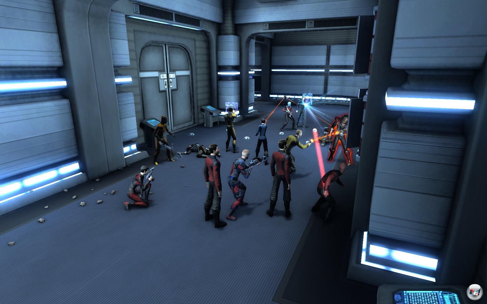 Das zweite Standbein sind die Bodenmissionen – und hier wackelt Star Trek Online gewaltig. Aus der 3rd-Person-Perspektive steuert man den Captain höchstpersönlich über Planten oder durch Raumstationen und wird dabei von den computergesteuerten Brückenoffizieren (tolle Idee!) oder anderen