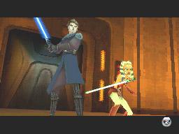 Da er aber nicht so flott kämpft wie ihr, dürft ihr euch in den Kampf einmischen, wenn ihr die übrigen Gegner erledigt habt. Um zu einem Widersacher zu gelangen, tippt ihr ihn einfach an und bereits eine Sekunde später ist euer Jedi zum Ziel gehüpft. Dann folgt Phase 1 des Dauergehämmers: Im Grunde reicht es, wie ein Berserker über den DS herzufallen und auf den Gegner einzuprügeln. Ab und zu solltet ihr allerdings die Schlaghöhe variieiren, damit euer Gegenüber nicht eure, sondern ihr seine Deckung durchbrecht.