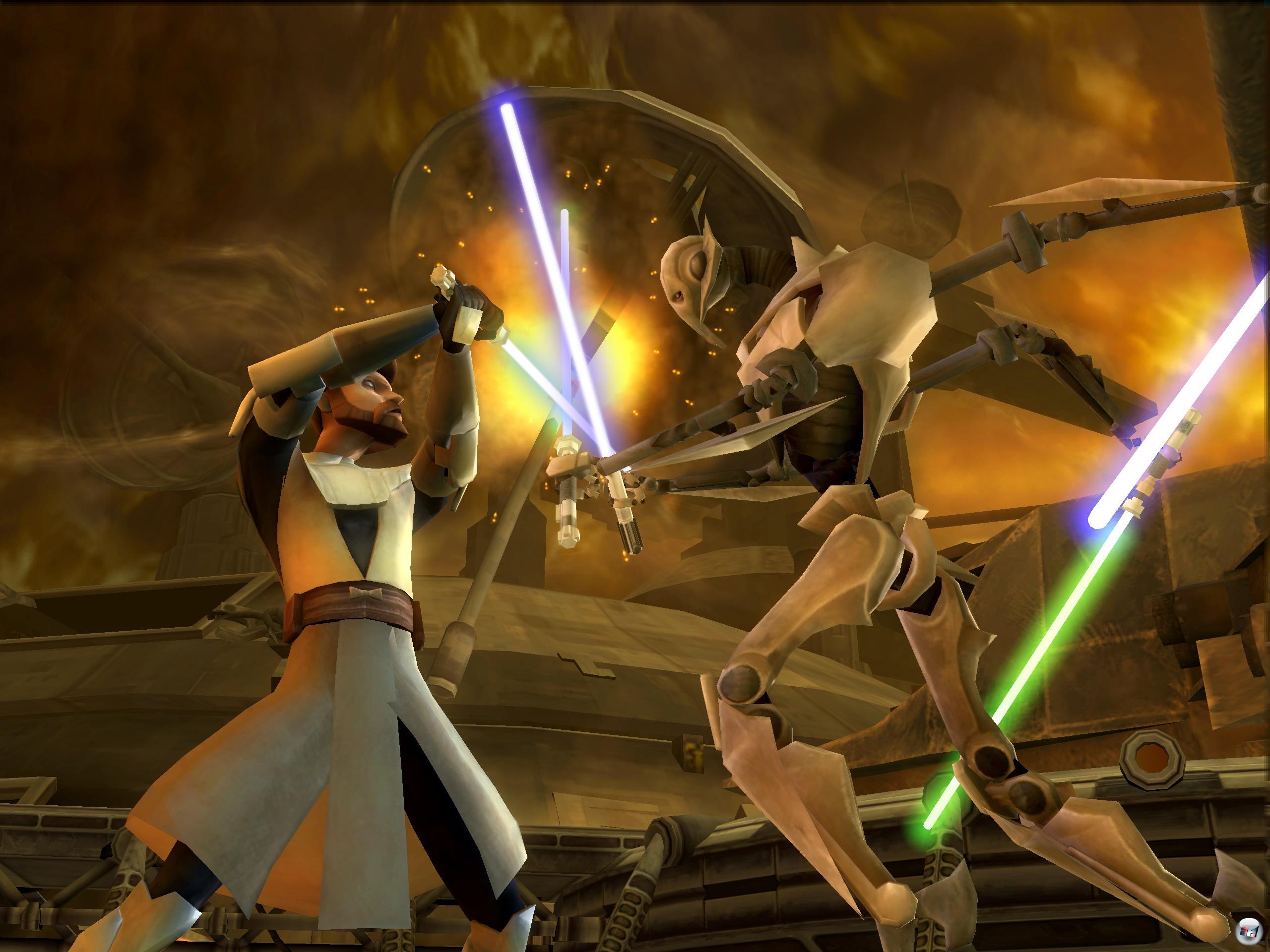 dem EG-5 Jedi Hunter Droid und einer Hand voll anderer finsterer Gesellen zusammen. Zwischen den Kämpfen erklärt euch ein aufgekratzter Wochenschau-Sprecher ein paar geschichtliche Zusammenhänge zwischen Episode 2 und 3 der Saga. Auch die Kämpfe selbst werden mit cineastischen Kameraperspektiven in Szene gesetzt.![]()