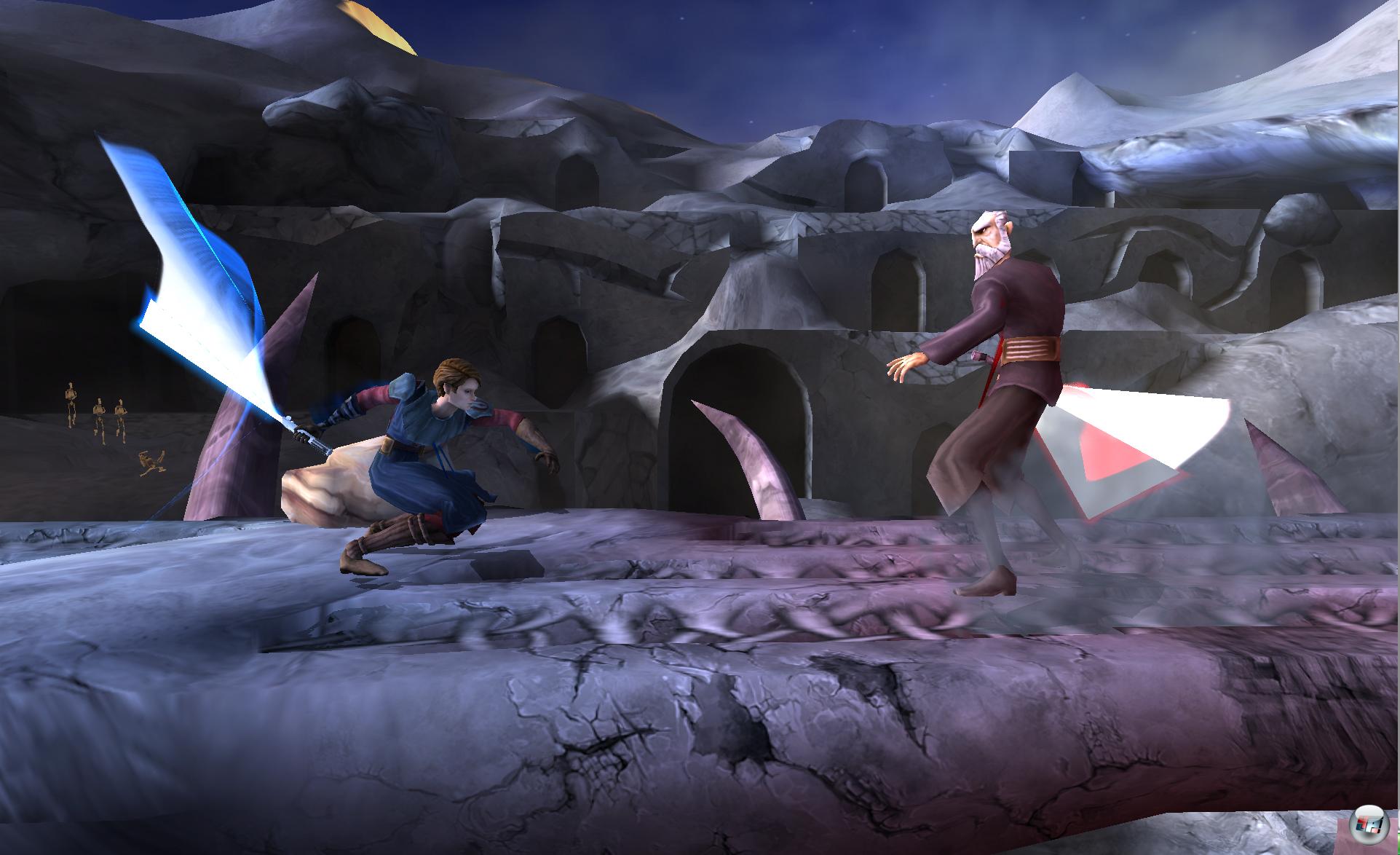 In beinah allen Szenarien herrscht das Chaos: ihr bekriegt euch über einem riesigen, mit Tentakeln wedelnden Kratermonster in der Wüste oder mitten zwischen Laser-Salven auf einem Schlachtfeld. Die Schauplätze sind alllesamt filmisch inszeniert und die Lichtschwerter surren und glühen, dass es jedem Star-Wars Fan warm ums Herz wird. Doch die schlichten Hintergrund-Texturen können in Punkto Detailreichtum nicht einmal mit dem rund zehn Jahre alte Power Stone auf Dreamcast mithalten. Auch die Laufbewegungen wirken reichlich staksig. Immerhin sorgen die recht ordentlich animierten Gesichter im Zeichentrick-Stil ein wenig dafür, dass ihr euch mit euren Lieblings-Jedis identifizieren könnt.