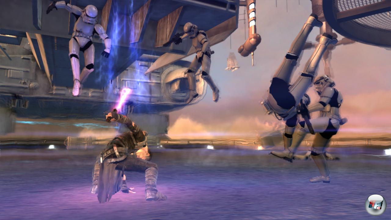 komprimiert, Laserschwerter mit Elektroschocks angeheizt und damit nach kreischenden Feinden geschmissen, Rancor-Monster fallen wie übergroße Fliegen, es regnet Kombos, es regnet Gegner, es regnet Macht – und zwar pausenlos auf die bedauernswerten Widersacher herab. Schon die vorherigen Jedi Knight-Teile von Lucas Arts haben die durchsetzungsfreudige Seite des Star Wars-Universums in den Vordergrund gestellt, aber TFU ist all das plus sieben Tonnen Rambo – hier werden mittels der Macht ordentlich Ärsche gekickt!