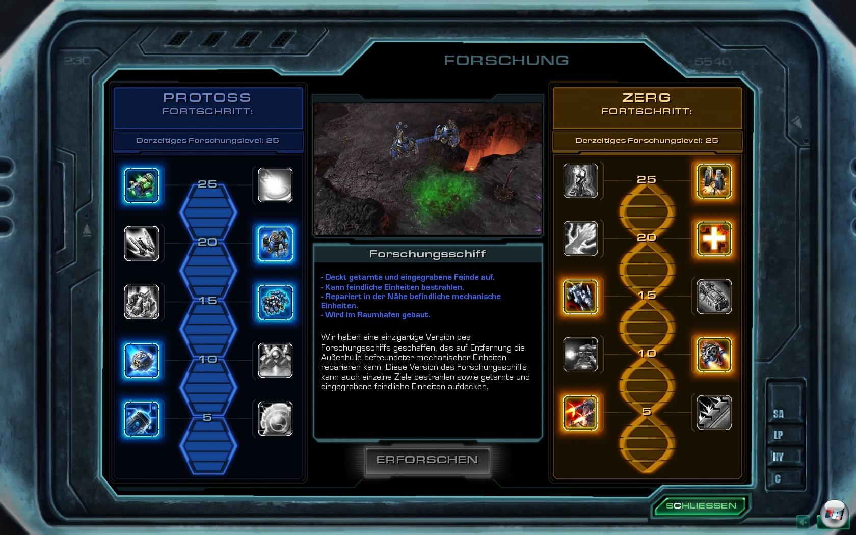 Des Weiteren darf man Forschung im Labor betreiben, solange man genug Protoss-Relikte oder Zerg-Genproben in den Missionen auftreibt – teilweise versteckt, andernorts unübersehbar. Bei jeweils fünf gesammelten Proben muss man sich für ein Forschungsprojekt entscheiden. Es stehen immer zwei Technologien bereit und nur eine kann ausgewählt werden. Beispiel: Sollen im Hauptgebäude künftig zwei Weltraumbaufahrzeuge (WBF) parallel gebaut werden können oder sollen die Vespingas-Quellen ohne WBFs als Transporter auskommen? Die Entscheidung ist endgültig und verführt dazu, die Kampagne erneut zu spielen, um alle Forschungsupgrades zu sehen. Neben Versorgungsdepots, die direkt aus dem Orbit auf der Oberfläche platziert werden können, sind Einheiten wie „Forschungsschiff“ oder „Raven“ bzw. „Predator“ (Anti-Infanterie) oder „Herkules“ (großer Truppentransporter) in diesem Techtree versteckt.