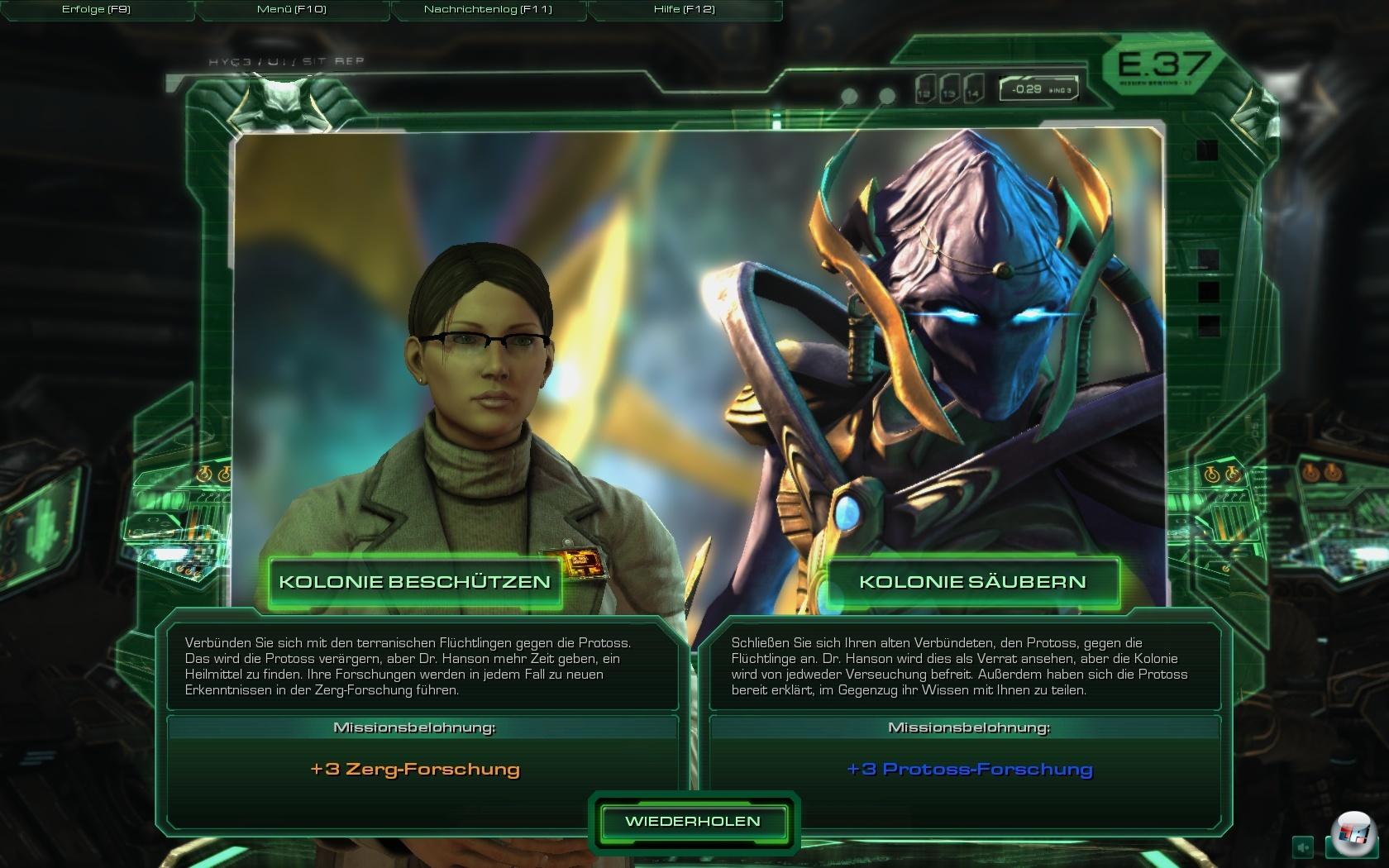 und das Rekrutieren der weiteren Crewmitglieder weiß zu überzeugen, fällt danach aber in ein kleines Loch, in dem die Story langsam oder kaum merklich fortgesetzt wird, während man fleißig Upgrades sammelt und Einheiten freischaltet. Erst mit den Protoss-Missionen, die ein integraler Bestandteil der Terraner-Kampagne sind und ohne die die Story nicht funktionieren würde, nimmt die Erzählung Fahrt auf und legt richtig los. Die vier Protoss-Missionen enden mit einer vernichtenden Schlacht und einem unerwarteten Paukenschlag, bevor die Story um Mengsk, seinen Sohn und Kerrigan wieder die Vorreiterrolle übernimmt. Nach diesem kleinen Hänger im ersten Drittel dreht die Geschichte dank des Protosskniffes spürbar auf, die Intensität kocht hoch und die Reaktionen der Protagonisten werden emotionaler, auch wenn sie nicht ganz an das Niveau von WarCraft III heranreichen.