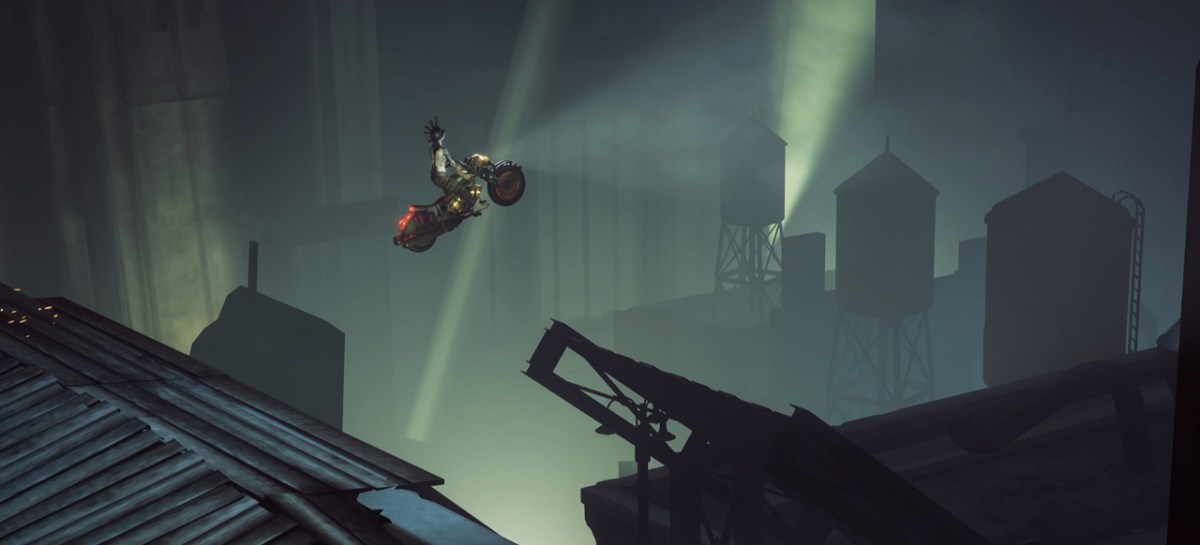Doch mit den zahlreichen Rampen, Sprüngen usw., bei denen man auch darauf achten muss, sein Gefährt in der Luft auszurichten, um den Schwung nicht zu verlieren, erinnert das Layout der Abschnitte viel häufiger an Spiele wie Trials – oder auch das ebenfalls von Tate stammende Urban Trial Freestyle. Dementsprechend muss man aufpassen, dass man in Plattformsequenzen, die sich mit durchaus chaotischer Action sowie interessanten Bosskämpfen abwechseln, genug Geschwindigkeit mitnimmt, um die vor einem liegenden Abgründe zu überqueren oder entscheidende Sprünge in neue Bereiche zu meistern. Die Auswahl des jeweiligen Bikers mitsamt seinem fahrbaren Untersatz nimmt dabei allerdings nur eine untergeordnete Rolle ein. Die vier weisen zwar nominell hinsichtlich Durchschlagskraft, Wendigkeit durchaus unterschiedliche Werte auf. Doch nur selten ist ein Wechsel nötig, um die Spezialisierungen zu nutzen, die jede(r) mitbringt. Immerhin kann man ohne Verzögerung zwischen den Figuren und ihren Motorrädern wechseln, um so im Zweifelsfall einem Ableben entgegen zu wirken. Alle haben übrigens am Vorderrad auch ein Sägeblatt angebracht, mit dem man sich nicht nur durch die