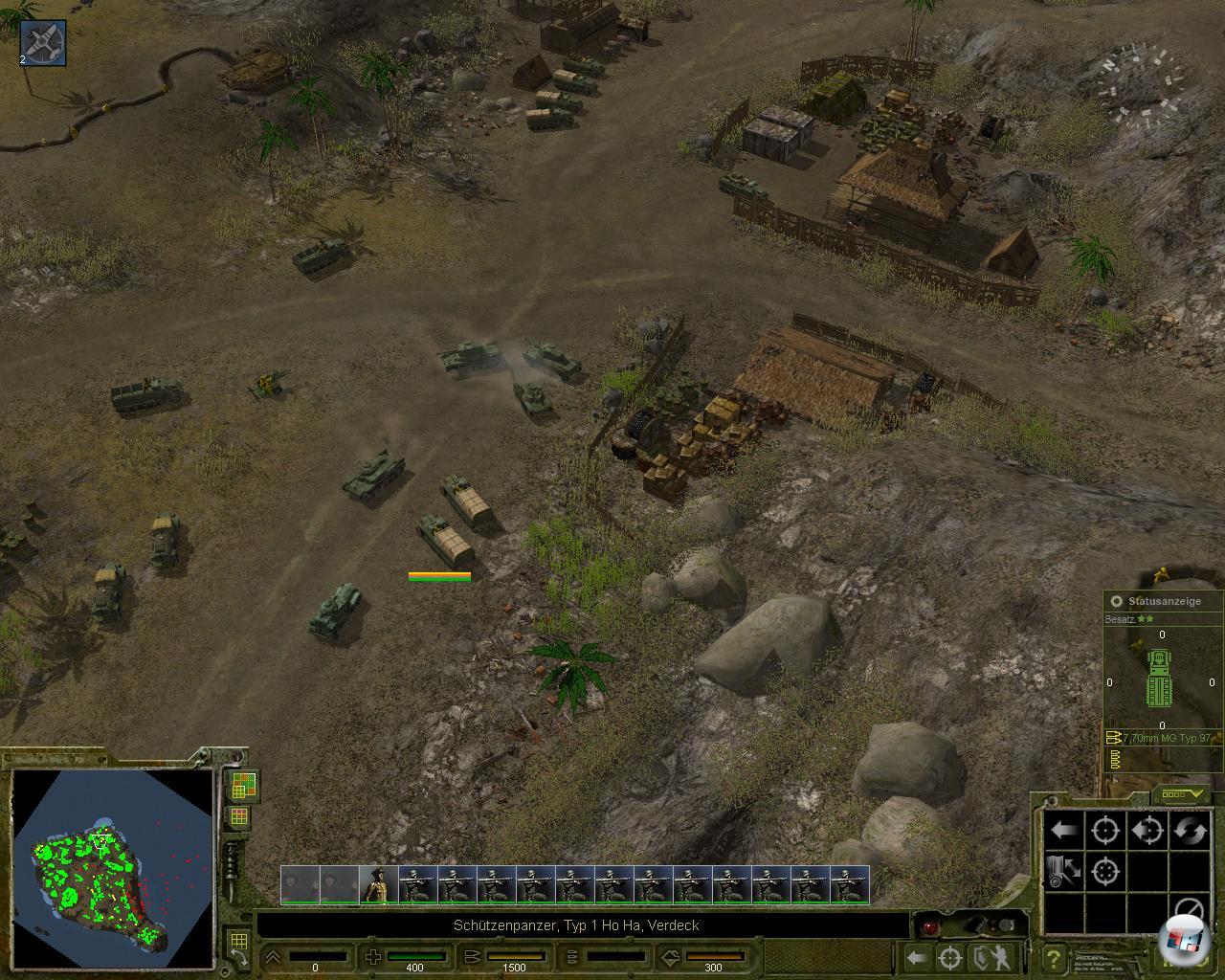 Und das, obwohl das Strategiespiel durchaus auch mal optische Highlights bietet. Es fängt mit der Umgebung an, die bis zu einem gewissen Grad zerstörbar ist. Bäume splittern, Häuser brechen zusammen und Bunker fliegen in die Luft. Wenn ein großes Geschütz sich aufrichtet und feuert, dann zittern die Blätter und es kommt schon so etwas wie Gefechtsstimmung auf. Man kann dann kurzzeitig verstehen, warum ein Raketenwerfer beim einfachen Landser so gefürchtet war, wenn er kreischend seine Streifen in den Himmel zieht. All das ist freilich wieder verflogen, wenn es allmählich zu ruckeln anfängt, sobald ein paar G.I.s zu viel durchs Bild huschen. Angesichts der nur mäßigen Grafik fragt man sich schon, warum es eigentlich zuckelt.