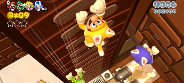 Die Antwort lautet: Multiplayer. Wer möchte, kann fast jederzeit bis zu drei Mitspieler einsteigen lassen, um mit ihnen das komplette Spiel durchzuzocken. Das funktioniert leider nur lokal, dort aber richtig gut. Anders als bei den letzten Mehrspieler-Marios friert der Bildschirm bei Treffern zum Glück nicht ein. Außerdem kommt man sich nicht so häufig in die Quere wie in den 2D-Marios oder bei Rayman Legends: Die schmalen Levels bleiben überschaubar, besitzen trotzdem genug Platz zum Ausweichen sind wie gemacht für lustige Koop-Sessions. Nur ab und zu verschwindet einer der Spieler aus dem Bild, was aber auch nicht allzu schlimm ist, weil er kurz danach in einer Blase wieder herbei schwebt – dazu später mehr.