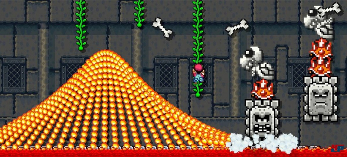 Manche Spieler haben die Mechanismen bereits so gut im Griff, dass sie regelrechte „Rube-Goldberg-Maschinen“ zusammen zimmern: Einfach nach vorne drücken und schon wird man im Express-Tempo durchs Level bugsiert. Nur wer exakt das macht, was der Baumeister vorgegeben hat, kommt meist wohlbehalten ans Ziel. Wer dagegen nervös wird und springt, verendet in großen Stachelpflanzen, der Lava oder anderswo im wuselnden Chaos. Erfreulich ist auch, dass sich im Baukasten die Kulisse so einfach verwandeln lässt. Der Hüpf-Marathon soll nicht auf der schnöden grünen Wiese steigen? Kein Problem: Mit der Leiste am linken Bildrand verwandelt sich die Welt auf Knopfdruck in die gängigen Szenarien aus 2D-Marios: eine finstere Unterwelt, ein Spukhaus, eine Festung oder eine Luftgaleere. Damit es auf Letzterer stilecht hektisch wird, darf man unterschiedlich schnelles Zwangs-Scrolling einbauen.