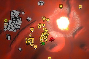 | Das Ende einer Multiplayer-Partie gegen die KI: Die Riesenspinne zerlegt meine Basis, während oben eine Atombombe eingeschlagen ist. |