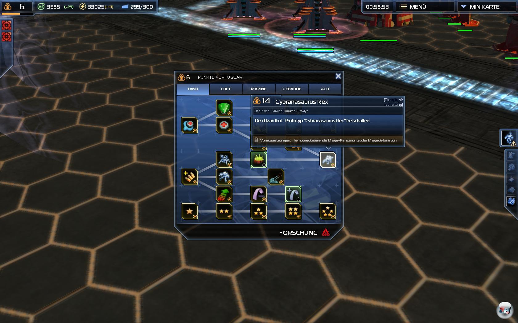 Ihr investiert Forschungspunkte in die Kategorien „Boden“, „Luft“, „See“, „Commander“ oder „Gebäude“ und spezialisiert euch so in eine Richtung – Ähnliches war bei Supreme Commander ebenfalls möglich, nur habt ihr euch dort ohne Forschung, sondern mit der Entscheidung, welches Gebäude der nächsten Tech-Stufe ihr bauen wollt, für einen militärischen Zweig entschieden (Luft, Marine, Boden, Einnisten). Nichtsdestotrotz ist dieses Forschungssystem eine gelungene Idee und kaschiert den sonstigen Kahlschlag mit vielen Upgrade- und Entwicklungsmöglichkeiten.