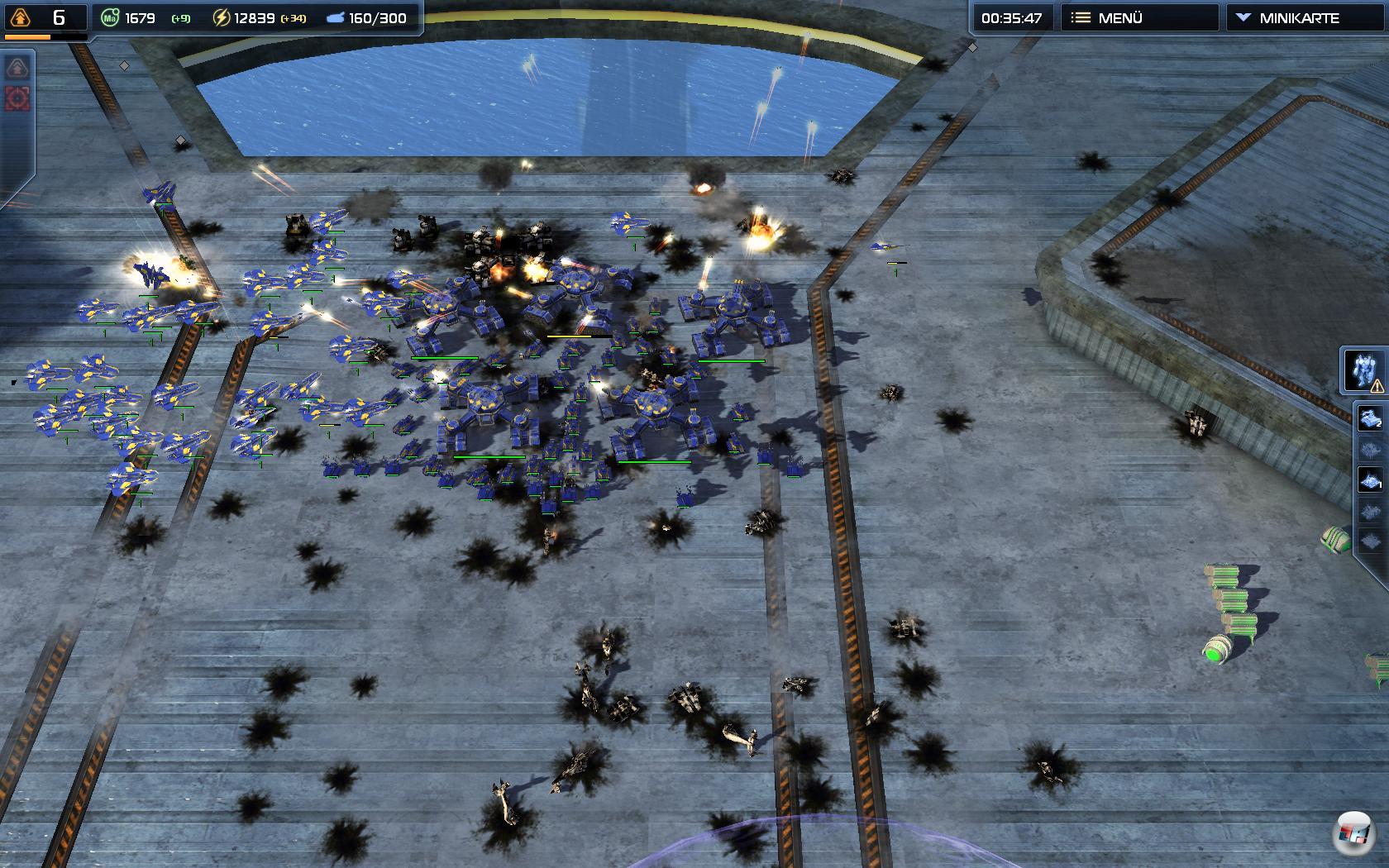 Gleichermaßen fällt das abgespeckte Baumenü auf, das prinzipiell in einer einzigen Symbolleiste Platz gefunden hätte. Neben Masse-Extraktor, Energiegenerator, den Boden-/Luft-/Marine-Fabriken findet ihr bloß einen Boden- und einen Luft-Verteidigungsturm. Prototypenfabriken, Schildgenerator, Radar und Co. sind zum Glück noch vorhanden und im Gegensatz zu Command & Conquer 4: Tiberian Twilight <a class="DYNLINK" onmouseover="DynToolTipp_Show('Klicken für Gameinfos‚)“ onmouseout=“DynToolTipp_Hide(); “ href=“javascript:DynCont_Display(‚Gamefinder‘,’runmod.php?sid=%7BSID%7D&LAYOUT=dyncont_gf&spielid=366323′)“>