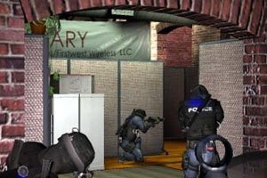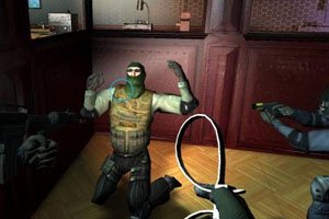 In einem spärlich beleuchteten Raum stehen fünf schwer bewaffnete Elite-Polizisten vor der verschlossenen Tür – der Auftrag: Geiseln retten, Gangster dingfest machen. Zuerst späht ihr mit einem Mix aus Spiegel und Kamera unter der Türschwelle her und erblickt zwei Schurken. Geiseln? Sind nicht zu sehen. Also Tür aufbrechen, Granate rein und die