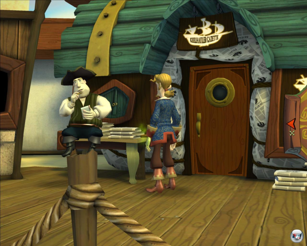 Einen ersten Anhaltspunkt liefert einem der geschwätzige Reporter des ortsansässigen Käseblattes, der leider kaum was zu berichten hat. Denn schließlich passiert nix, weshalb seine tolle Druckerpresse meist still steht. Es gibt noch nicht mal ne ordentliche Keilerei. Das muss sich ändern, denn der Held muss dafür sorgen, damit der Kollege endlich was zu schreiben hat. Ansonsten will er nicht verraten, wie’s weitergeht. Dafür müssen nun einige Heldentaten vollbracht werden, um die voll auf Seeräuberpistolen gepolte Leserschaft zufrieden zu stellen. Ein Klacks für den schlechtesten aller Seeräuber, der bestimmt wieder was verschusselt! Einen Haken hat die Sache aber noch, denn Flotsam Island kann man nicht mehr verlassen. Ein Fluch sorgt dafür, dass der Wind immer nur aus einer Richtung bläst. Leider aus der falschen, so dass seit Jahr und Tag kein Schiff auslaufen kann. Das könnte natürlich auch ein Naturphänomen sein, aber Piraten sind halt abergläubisch, so dass dunkle Mächte dahinter stecken müssten.