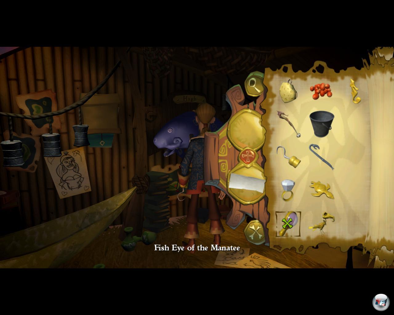 zu vergleichen, da sie viel simpler sind. Man muss leider sagen, dass es sich meist um die übliche Telltale-Knobeleien handelt, für die man den Kopf nicht wirklich anstrengen muss. Schon eher muss man ein wenig rumprobieren, ohne dass das ausarten würde. Meist ist es damit getan, einen Gegenstand am richtigen Ort anzubringen. Bisweilen muss man auch mehrere Sachen kombinieren wie etwa beim Fischen, was im Inventar leichter vonstatten gehen könnte. Dass man die zu kombinierenden Sachen immer erst einzeln anklicken muss ist, um dann denn Kombiniere-Knopf zu drücken, ist schon recht umständlich.