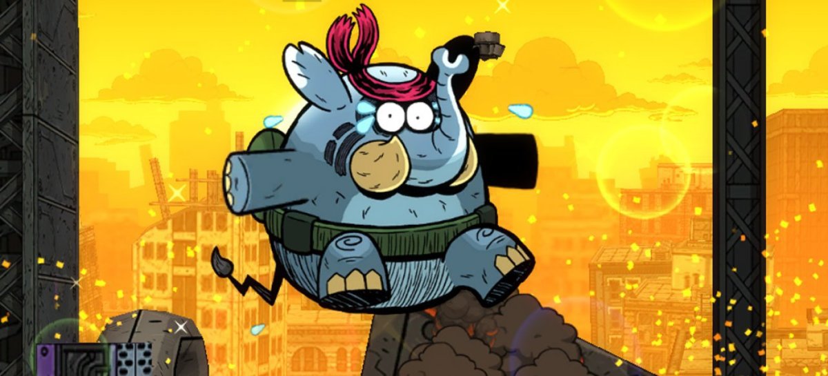 Da der gewichtige Dickhäuter sich entsprechend träge bewegt, entsteht im Vergleich zur aktuellen Konkurrenz ein angenehm eigenständiges Spielgefühl. Es ist richtig befriedigend, durch massenhaft aufgetürmte Autowracks und Barrikaden zu rammen, auszuweichen, mit passendem Timing los zu dreschen und klingelnde Kombos aufzustellen. An ein paar ähnlich „träge“ Titel fühlte ich mich natürlich trotzdem erinnert, z.B. Wario, Strider und Altered Beast vom Mega Drive oder auch das aktuellere Völgarr The Viking. Dank Tembos Energiereserven und fair verteilter Speicherpunkten wird es aber zum Glück nicht ganz so erbarmungslos schwer wie beim Wikinger. Auch die wenigen Bosse wie ein Heli oder Drachenpanzer sorgen mit ein paar Angriffsphasen und Projektilattacken für eine passende Mischung.