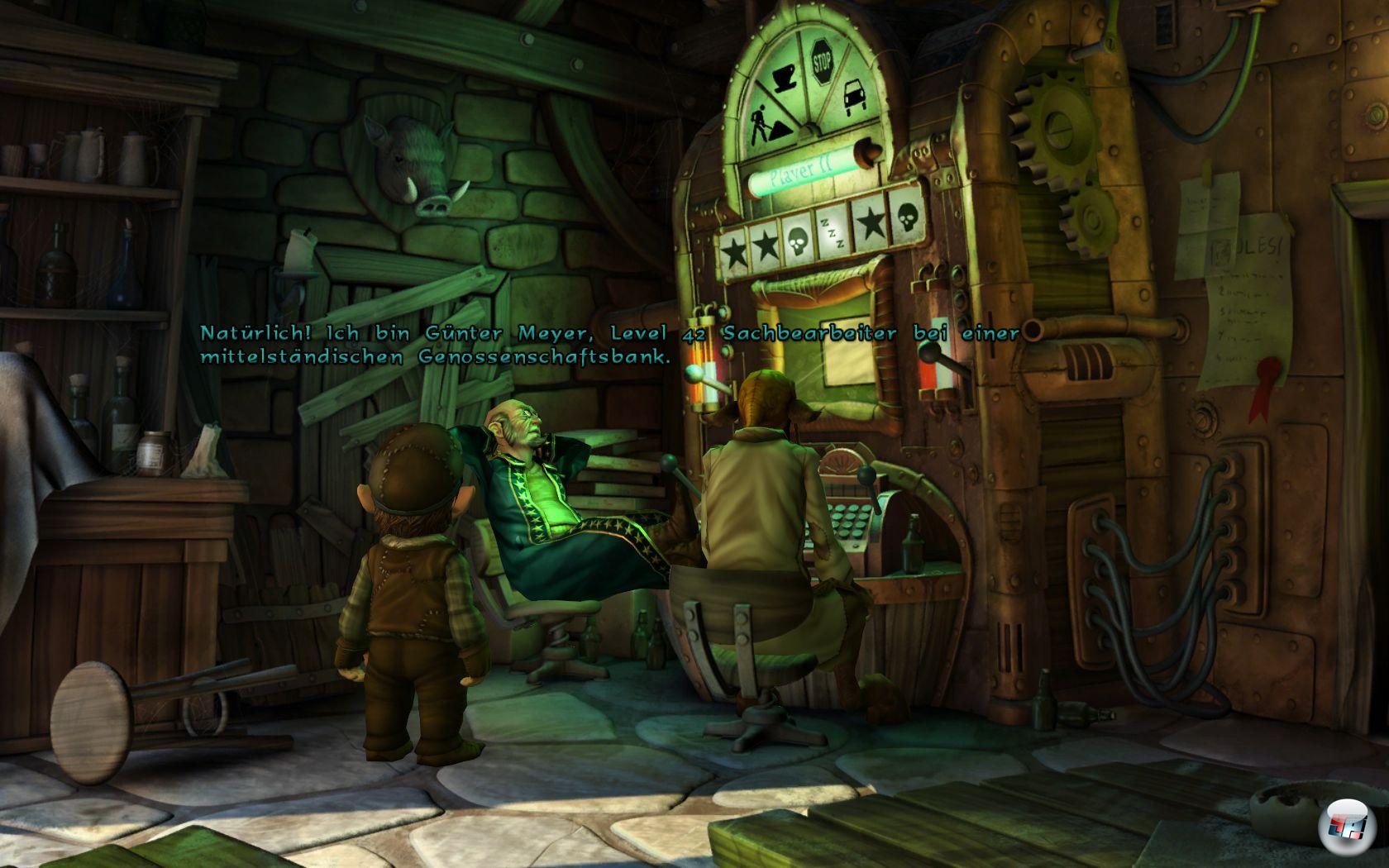 Nicht nur der Herr der Ringe bekommt in diesem Spiel sein Fett weg. Eine meiner ersten Aufgaben ist, in der verlassenen Garnison Seefels einen Zauberer und einen Händler von einem extrem süchtig machenden Online-Rollenspiel wegzulocken. Die beiden Zocker waren ihr langweiliges Leben in der magischen Welt satt und haben ihre Erfüllung in der fantastischen Welt der Bürokratie gefunden. Das Spiel, vor dem sie ununterbrochen seltsam anmutende Hebel und Tasten bedienen, trägt den treffenden Titel World Of Bureaucracy (WOB). Keine langweiligen Zaubersprüche mehr, keine ermüdenden epischen Schlachten, keine geheimnisvolle Schätze – stattdessen besteht ihr Leben jetzt aus Formularen, Steuererklärungen, Bußgeldbescheid-Quests und anderem unfassbar spannenden Papierkram.