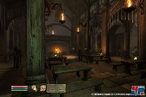 Wer sich abseits des Hauptpfades durch die Wildnis schlägt, Dörfer und Dungeons erkundet oder Städte entdeckt, versinkt schnell in einer Flut von Quests, erlebt ohne strikte Reihenfolge seine eigenen kleinen Abenteuer. Er kann sich aber jederzeit wieder in die Strömung der eigentlichen Story stürzen und sich vom spannenden Plot treiben lassen. Das Bedrohungsszenario aus einer fremden Welt ist zwar nicht neu, das dämonische Feindbild scheint klischeebehaftet und der erzählerische Rhythmus vibriert durchaus in einem Herr der Ringe-Takt, aber alles wirkt dennoch sehr eigenständig, sehr durchdacht. Und diese enorme Freiheit erinnert positiv an Spiele wie Grand Theft Auto: San Andreas <a class="DYNLINK" onmouseover="DynToolTipp_Show('Klicken für Gameinfos‚)“ onmouseout=“DynToolTipp_Hide(); “ href=“javascript:DynCont_Display(‚Gamefinder‘,’runmod.php?sid=%7BSID%7D&LAYOUT=dyncont_gf&spielid=5997′)“>. Es gibt keine künstlichen Levelbegrenzungen wie in Fable oder KotOR. Auch die Entwicklung eures Charakters gehört dazu: Zwar wählt ihr zu Beginn über eure Rasse und Klasse Schlüsselattribute, die dann von Anfang an stärker ausgebildet sind, aber je nach Spielweise könnt ihr euch überall verbessern: Wer oft mit stumpfen Waffen austeilt, wird hier ebenso Punkte sammeln wie jemand, der oft schleicht oder oft feilscht. Man ist das, was man spielt. Es sei denn, man trifft einen Trainer: Der kann euch gegen Bares wertvollen Unterricht erteilen und so schneller ausbilden.