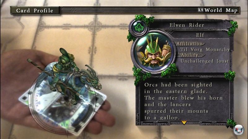 Vor allem der namenlose Sprecher, der bei Zaubern in seinem Kapuzenumhang auftaucht und quasi die Stimme, das Auge und den Richter darstellt, sorgt für das angenehme Gefühl, hier keine anonyme Technik namens PLAYSTATION Eye, sondern einen Rollenspielleiter nach alter Pen&Paper-Schule vor sich zu haben. Das ist er natürlich nicht, denn es gibt weder Quests noch eine Kampagne. Aber seine düstere Stimme fordert zum Nachziehen oder Ablegen auf, sein tiefer Brunnen materialisiert sich plötzlich in tiefem Blau auf der Mattscheibe und schluckt geopferte Karten.